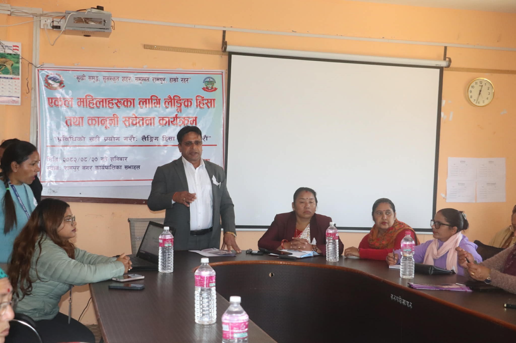 पाल्पा,२० मंसिर । एकल महालहरुका लागि लैङ्गिक हिंसा तथा कानूनी सचेतना कार्यक्रम शनिबार रामपुर नगरपालिकामा सम्पन्न भएको छ । महिला हिंसा विरुद्धको १६ दिने अभियान अन्तर्गत नगरपालिका भित्रका एकल महिलाहरुका लागि लैंगिक हिंसा र कानुनी व्यवस्था सम्बन्धी सचेतना प्रदान गरिएको हो ।कार्यक्रममा समाजमा हुने हिंसा, यसको अवस्था, निम्त्याउन सक्ने दुर्घटना, यसको न्यूनीकरण , कानुनी उपचार लगाएतका विषयमा सहजिकरण गरिएको थियो । सचेतना कार्यक्रममा बोल्दै रामपुर नगरपालिकाका नगर प्रमुख रमण बहादुर थापाले एकल महिलाहरुलाई सामाजिक रुपबाटै हुने विभिन्न किसिमका हिंसाहरु चुनौतीको रुपमा रहेको उल्लेख गर्नुभयो । यसका लागि हिंसाको कानुनी उपचार खोज्न आवश्यक रहेको बताउनुभयो । उहाँले आफु एकल भए पनि विभिन्न सिप र उद्यमको माध्यमबाट आत्मनिर्भर बन्न आग्रह समेत गर्नुभयो ।यसका लागि रामपुर नगरपालिका संधै साथमा रहेको बताउनुभयो ।
