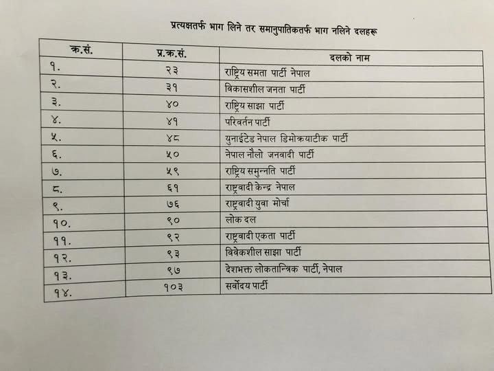 यद्यपि ती १४ दलमध्ये कतिपयले भने अर्को दलको निर्वाचन चिन्हमा समानुपातिकतर्फ भाग लिने भएकाले छुट्टै आफ्नो दललाई समानुपातिकतर्फ भाग नलिने गरी दल दर्ता नगराएका समानुपातिकतर्फका सहायक निर्वाचन अधिकृत एवं आयोगका सहसचिव यज्ञप्रसाद भट्टराईले नेपाल प्रेसलाई जानकारी दिए । उनका अनुसार समानुपातिकतर्फ भाग लिनका लागि ९३ निर्वाचन चिन्हमा १०० दलले दर्ता गराएका छन् ।
