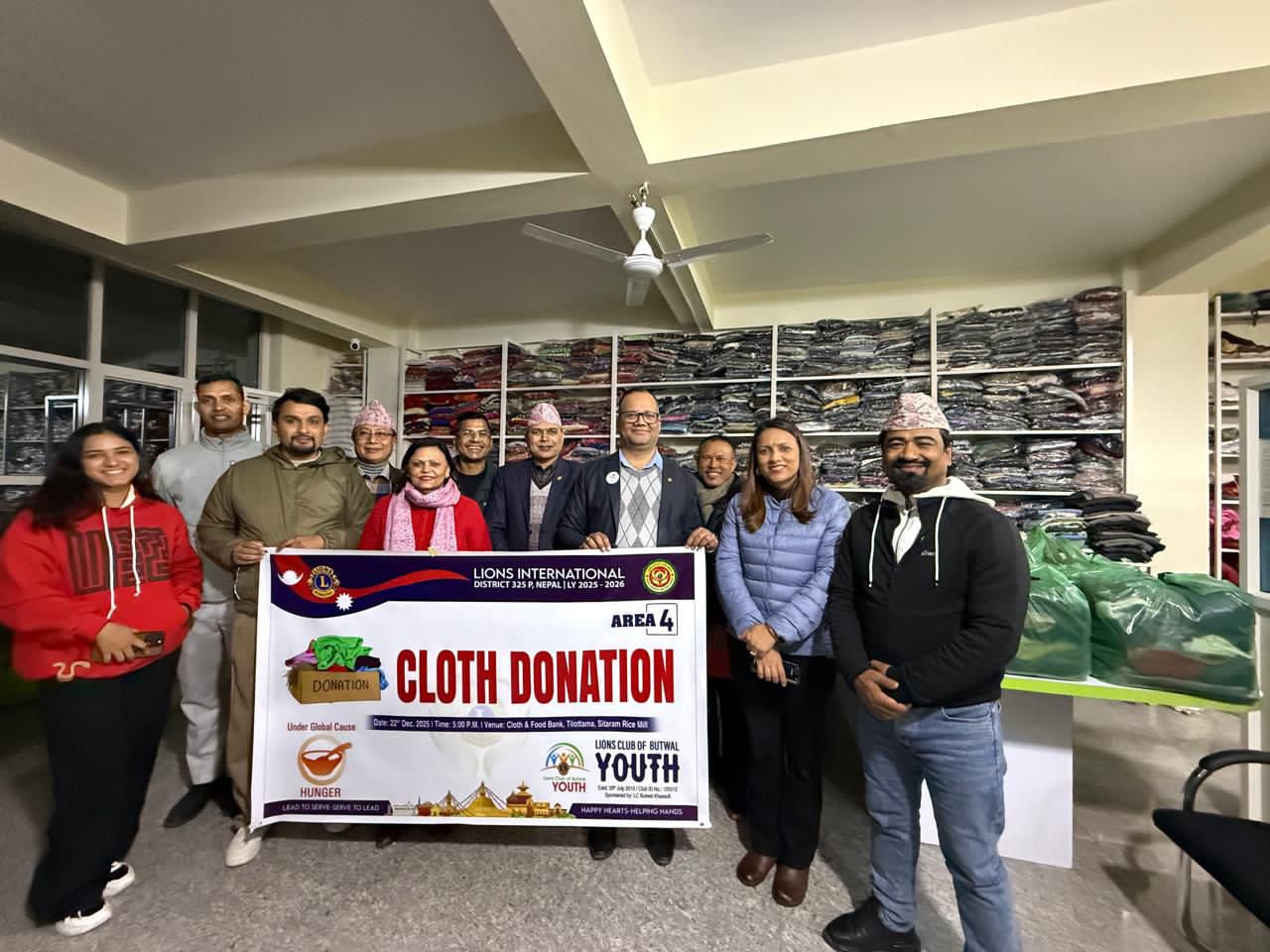 बुटवल ,९ पुस ।लायन्स क्लब अफ बुटवल युथले जाडोयाममा न्यानो वितरण गर्ने अभियान अन्तर्गत क्लोथ बैंक बुटवललाई करिब ३५० थान न्यानो कपडा हस्तान्तरण गरेको छ। क्लबको करिब एक महिनादेखिको योजनाअनुसार संकलित कपडा एक कार्यक्रमका बीच क्लोथ बैंक बुटवललाई प्रदान गरिएको हो।