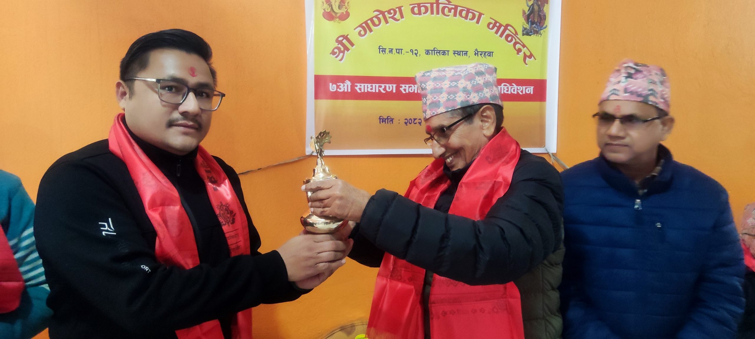 भैरहवा,१९ पुस । रुपन्देही जिल्लाको मुटुमा अवस्थीत एतिहासिक श्री गणेश कालिका मन्दिर सञ्चालक समितीको शनिवार सम्पन्न सातौ साधारणसभा एवं चौथो अधिवेशनबाट समाजसेवी ज्ञान प्रसाद काफ्लेको नेतृत्वमा नयाँ कार्यसमिती सर्वसहमत निर्विरोध रुपमा चयन भएको छ । संस्थाको विधान बमोजिम भएको उक्त अधिवेशनबाट उपाध्यक्ष पदमा विश्व काफले, सचिवमा टिकाराम भट्टराई, कोषाध्यक्षमा तिलक कुमार प्रधान, सहसचिवमा शारदा पन्त, सहकोषाध्यक्षमा बाबुराम न्यौपाने र सदस्यहरुमा कृष्णराज गिरी, सावित्री बराल, मिना श्रेष्ठ, राम बन्जाडे, गिता गौतम सर्वसहमत निर्विरोध चयन भएको निर्वाचन प्रमुख अधिवक्ता कृष्णप्रसाद ढकालले जानकारीदिनुभयो ।