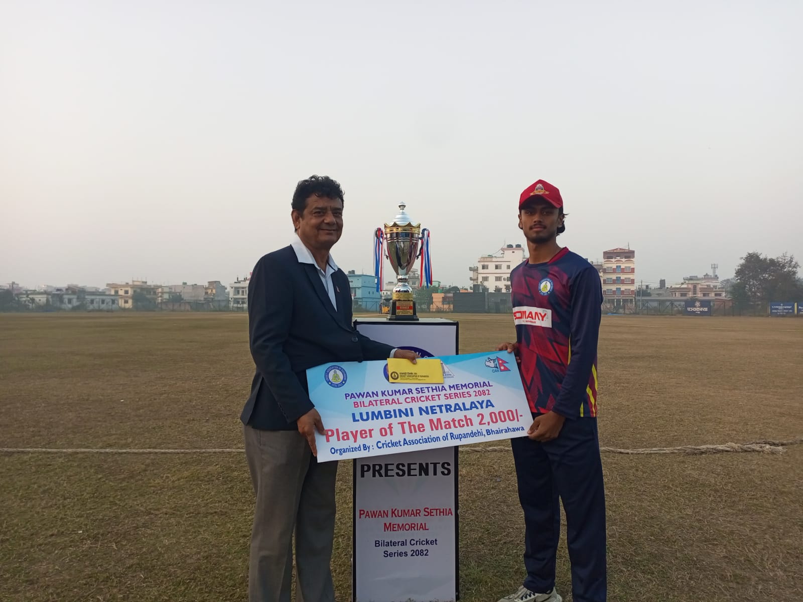 भैरहवा, २८ पुस । रुपन्देही क्रिकेट संघको आयोजनामा भैरहवामा जारी ‘पवनकुमार सेठिया स्मृति क्रिकेट प्रतियोगिता’ अन्तर्गत एकदिवसीय सिरिज रुपन्देही–११ ले क्लिनस्वीप गरेको छ । सिरिजको अन्तिम खेलमा आइतबार रुपन्देहीले त्रिभुवन आर्मी क्लब ‘ए’लाई ८२ रनले हराउँदै सिरिज क्लिनस्वीप गरेको हो । रुपन्देहीले सिरिजको पहिलो खेल ८७ र दोस्रो खेल ४९ रनले जितेको थियो । यसअघि भएको दुई दिवसीय टेष्ट पनि रुपन्देहीले जितिसकेको छ । भैरहवास्थित सिद्धार्थ क्रिकेट मैदानमा भएको सिरिजको अन्तिम खेलमा टस जितेर ब्याटिङ गरेको रुपन्देहीले मौसमका कारण २८ ओभरमा छोट्याइएको खेलमा ७ विकेट गुमाएर १ सय ९१ रनको बलियो योगफल बनायो । उसका लागि अमर मिश्राले ३९, मिर्नाल गुरुङले ३१, देव खनालले २८, समीर अलीले २२, आकाश त्रिपाठीले १८, निश्चल ज्ञवालीले १६ र प्रज्वल थापाले १५ रनको योगदान गरे । बलिङमा आर्मीका घनश्याम पाण्डेले २ तथा अनिश धामी, कृष्णप्रसाद भट्टराई, पवन कार्की र जितेन्द्रसिंह ठकुरीले समान १–१ विकेट लिए । जवाफी ब्याटिङ गरेको आर्मी २४ ओभर ५ बलमा अलआउट हुँदै १ सय ९ रनमा सीमित रह्यो । उसका लागि अनिश धामीले २६, प्रेम गुरुङले २५, पवन कार्कीले २३ र जितेन्द्रसिंह ठकुरीले १२ रन बनाए । बलिङमा रुपन्देहीका सन्देश थापाले ४, देव खनालले २ तथा विप्रसन केसी, अजयकुमार चौहान र मिर्नाल गुरुङले १–१ विकेट लिन सफल भए । खेलमा सन्देश थापा प्लेयर अफ द म्याच भई दुई हजार रुपैयाँ प्राप्त गरे । नेपालमै पहिलोपटक तीनवटा फम्र्याटमा दुई टीमबीच प्रतिस्र्धा भइरहेको हो । दुई दिवसीय टेष्ट र एकदिवसीय सिरिज सकिएसँगै अब टि–ट्वान्टी सिरिज हुने प्रतियोगिता संयोजक प्रथम पराजुलीले जानकारी दिए । प्रतियोगितालाई भैरहवाका व्यवसायी हरिष सेठिया र सुनिल सेठियाले आफ्ना बुवा स्वर्गीय पवन कुमार सेठियाको स्मृतिमा मुख्य प्रायोजन गरेका छन् । प्रतियोगितामा विजेता टीमले ट्रफी, मेडल र प्रमाण पत्र प्राप्त गर्नेछन् । यस्तै, म्यान अफ द सिरिजले ५ हजार र प्रत्येक खेलको म्यान अफ द म्याचले २ हजार रुपैयाँ प्राप्त गर्ने छन् । यी दुबै पुरस्कार भैरहवाको लुम्बिनी नेत्रालय प्रालिले प्रायोजन गरेको छ ।