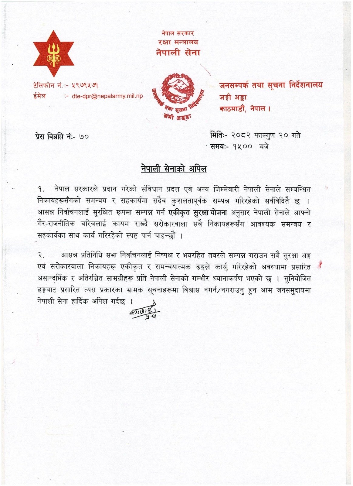• काठमाडौँ,२० फागुन । भोलि(बिहीबार) हुन लागेको प्रतिनिधि सभा निर्वाचनको सन्दर्भमा सामाजिक सञ्जाल तथा अन्य माध्यमहरूबाट सम्प्रेषण भइरहेका भ्रामक र अतिरञ्जित सूचनाप्रति सेनाले ध्यानाकर्षण भएको जनाएको छ