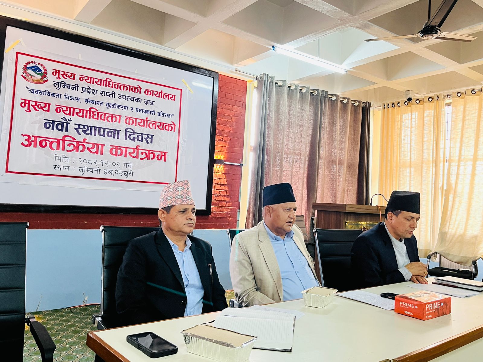 कार्यक्रममा कार्यालय प्रमुख एवं उपन्यायाधिवक्ता ऋषिकेश बस्यालले कार्यालयको समिक्षात्मक प्रतिवेदन प्रस्तुत गर्नुभएको थियो । प्रतिवेदनमा लुम्बिनी प्रदेश मुख्य न्यायाधिवक्ताको कार्यालय २०७४ चैत २ गते स्थापना भएको र सुरुमा बुटवलमा रहेको कार्यालय २०७९ मंसिर २८ गतेदेखि स्थायी राजधानी राप्ती उपत्यका देउखुरीस्थित आफ्नै भवनबाट सञ्चालन हुँदै आएको उल्लेख गरिएको छ ।