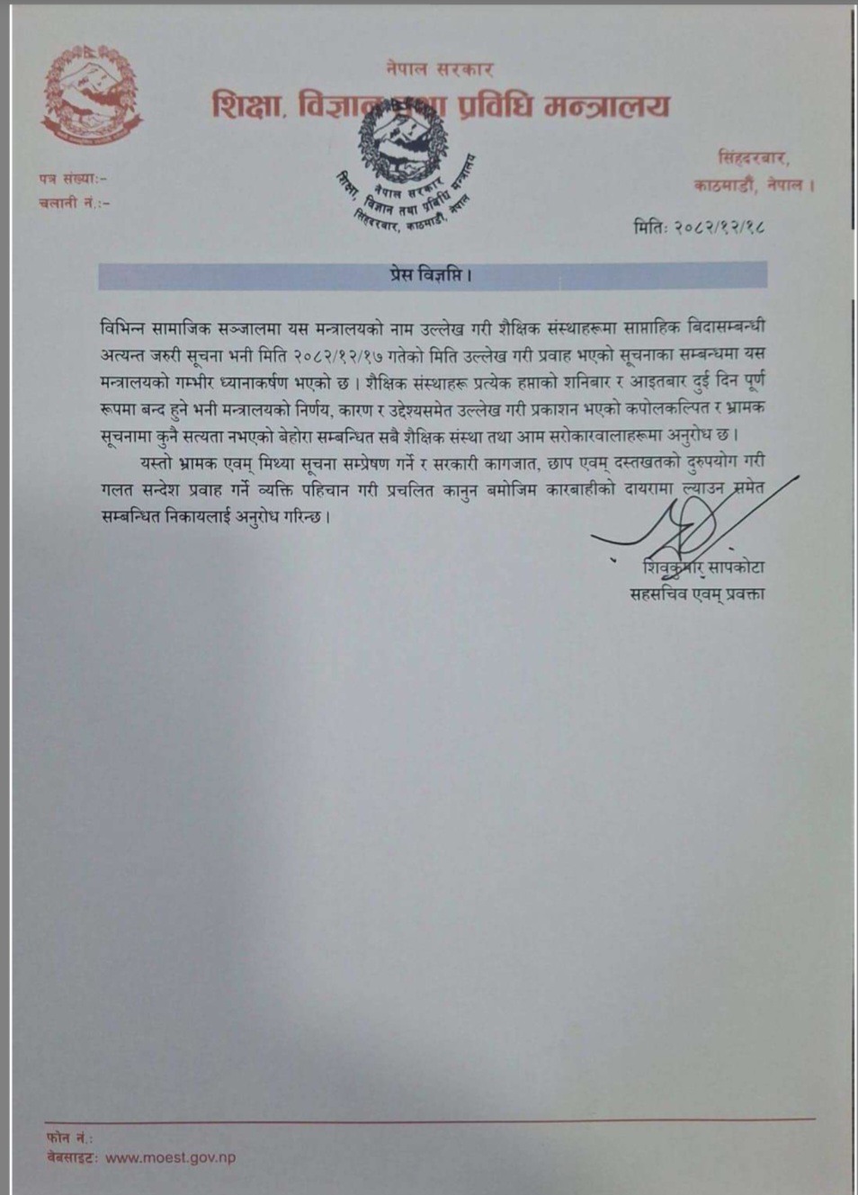 काठमाडौँ,१८ चैत । शिक्षा, विज्ञान तथा प्रविधि मन्त्रालयले सामाजिक सञ्जालमा फैलिएको शैक्षिक संस्थाहरू हप्ताको शनिबार र आइतबार पूर्ण रूपमा बन्द हुने भनी मिति २०८२/१२/१७ को सूचना प्रति गम्भीर ध्यानाकर्षण भएको जनाएको छ।