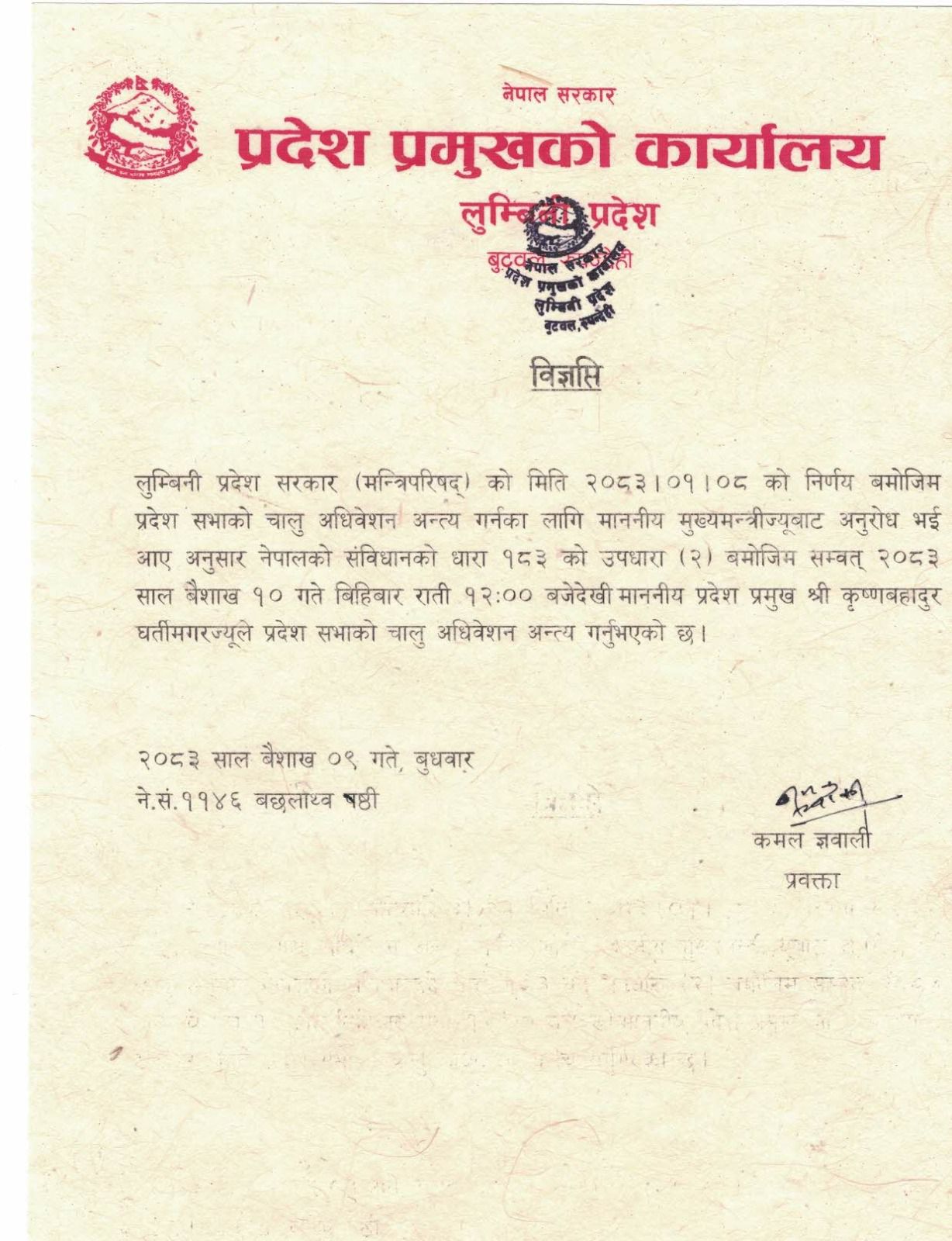 बुटवल,१० बैशाख । लुम्बिनी प्रदेश सभाको चालु अधिवेशन अन्त्य गरिएको छ । प्रदेश मन्त्रिपरिषद्को सिफारिसमा नेपालको संविधानको धारा १८३ को उपधारा (२) बमोजिम प्रदेश सभाको चालु अधिवेशन अन्त्य गरिएको हो । वैशाख १० गते बिहिवार राति १२ बजेदेखि लागू हुने गरी प्रदेश प्रमुख कृष्णबहादुर घर्ती मगरले अधिवेशन अन्त्य गर्नुभएको प्रदेश प्रमुखको कार्यालयका प्रवक्ता कमल ज्ञवालीले जानकारी दिनुभएको छ । प्रदेश सरकार (मन्त्रिपरिषद्) को निर्णय अनुसार मुख्यमन्त्री चेतनारायण आचार्य मार्फत गरिएको अनुरोधका आधारमा अधिवेशन अन्त्य गरिएको विज्ञप्तिमा उल्लेख गरिएको छ । हिउँदे अधिवेसनमा १६ वटा बैठक बसेका थिए । बिहिवार विहान साढे ११ बजे बसेको १६ औं बैठकमा प्रदेश प्रमुख कार्यालयबाट प्राप्त भएको अधिवेसन अन्त्य सम्वन्धि पत्र सभामुख तुलाराम घर्तीमगरले पढेर सभामा सुनाउनुभएको थियो ।