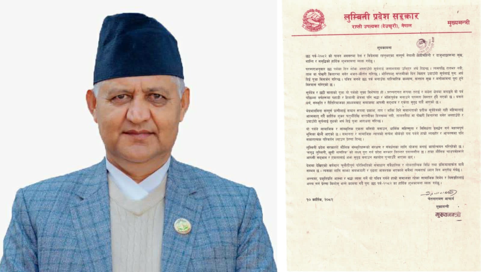 दाङ,१० कार्तिक । लुम्बिनी प्रदेशका मुख्यमन्त्री चेतनारायण आचार्यले छठ पर्वले सामाजिक एकता, समानता र सद्भाव सुदृढ बनाउन महत्वपूर्ण भूमिका खेल्दै आएको बताउनुभएको छ । उहाँले धार्मिक सहिष्णुता, सांस्कृतिक विविधता र सकारात्मक व्यवहारको विकासमा पनि यस पर्वले प्रेरणा दिएको उल्लेख गर्नुभएको हो । छठ पर्व–२०८२...