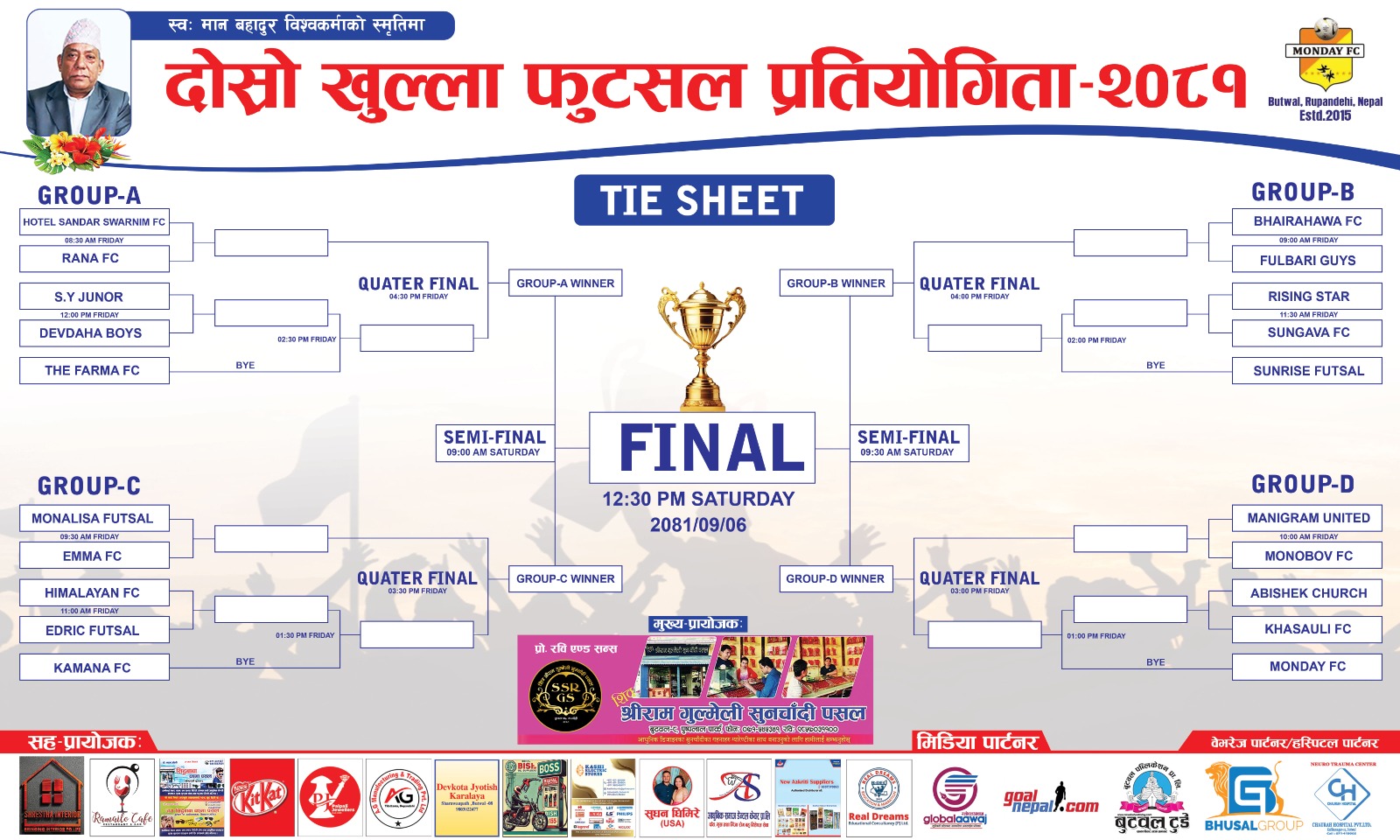 स्वर्गिय मान बहादुर विश्वकर्माको स्मृतिमा शिव श्रीराम गुल्मेली सुनचादी पसलद्धारा प्रयोजित गरिएको प्रतियोगिताको विहिबार पत्रकार सम्मेलन गरि कप अनावरण तथा टाईसिट सार्वजनिक गरेको छ । प्रतियोगिता तयारी पुरा भएको क्लबका अध्यक्ष रबि विश्वकर्माले बताए । फुटसलको क्रेजलाई मध्येनजर गरि प्रतियोगिता गर्न लागेको उनले सचिव मंजिल बिश्वकर्मा बताए । रुपन्देही फुटबलको उर्वरभुमी भएको प्रमाण यहा हुने खेल गतिविधिको निरन्तरताले दिने उनको दाबी छ ।