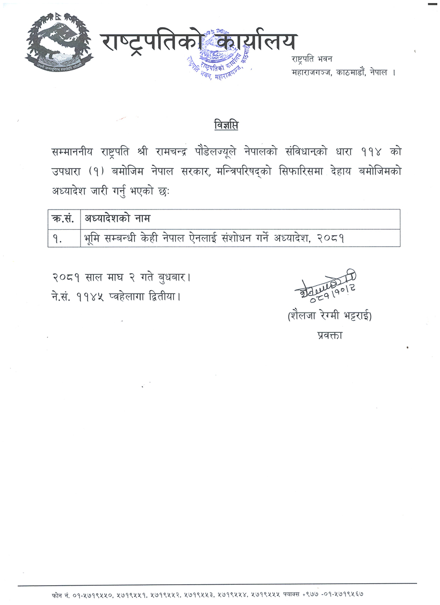 काठमाडौं,२ माघ । राष्ट्रपति रामचन्द्र पौडेलले भूमिसम्बन्धी अध्यादेश जारी गरेका छन् ।