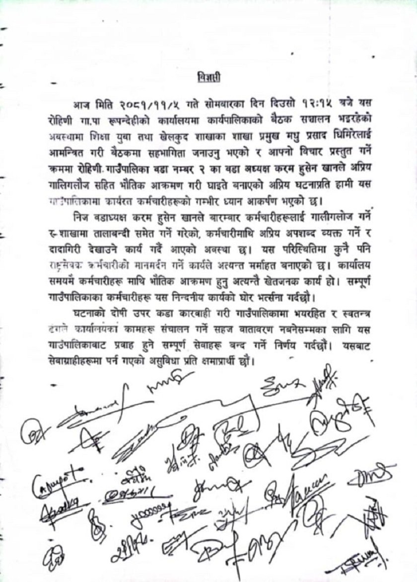 घिमिरेमाथि हातपात भएको कर्मचारीहरूको भनाइ छ । गाउँपालिकामा कार्यरत कर्मचारीहरूले विज्ञप्ति जारी गर्दै दोषीमाथि कारबाही नहुँदासम्म काममा नफर्कने समेत अडान लिएका छन् । रोहिणी गाउँपालिका रुपन्देहीको कार्यालयमा कार्यपालिका बैठक सञ्चालन भइरहेको अवस्थामा घिमिरेमाथि हातपात भएको जनाइएको छ ।