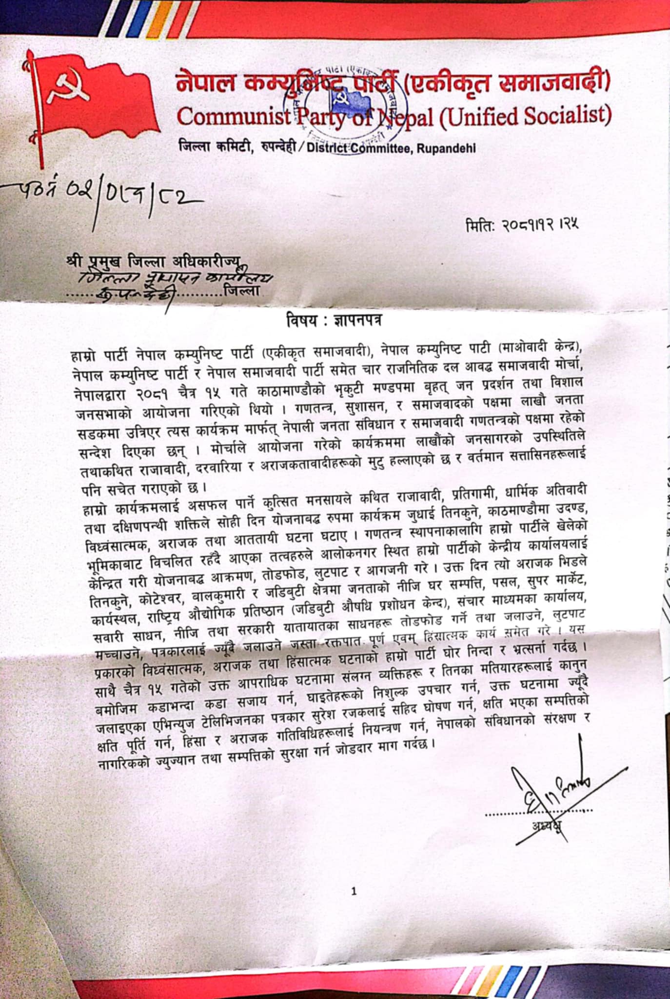 भैरहवा,२५ चैत ।नेकपा एकीकृत समाजवादी रुपन्देहीले प्रमुख जिल्ला अधिकारी मार्फत सरकारलाई ज्ञापनपत्र बुुझाएको छ । गत चैत १५ गते नेकपा माओवादी केन्द्र, नेपाल कम्युनिष्ट पार्टी र नेपाल समाजवादी पार्टी समेत चार राजनितिक दल आवद्ध समाजवादी मोर्चा, नेपालद्वारा काठामाडांैको भृकुटी मण्डपमा बृहत् जन प्रदर्शन तथा विशाल जनसभाको आयोजना गरिएको बेला गणतन्त्र, सुशासन, र समाजवादको पक्षमा लाखौ जनता सडकमा उत्रिरहेका बेला राजावादीहरुले हिंसात्मक गतिविधि गर्दा राज्य चुप लागेर बसेकोले सच्चिन माग गर्दै ज्ञापन पत्र बुुझाएको नेकपा एकीकृत समाजवादी रुपन्देहीका अध्यक्ष हिराध्वज शाहले बताए ।