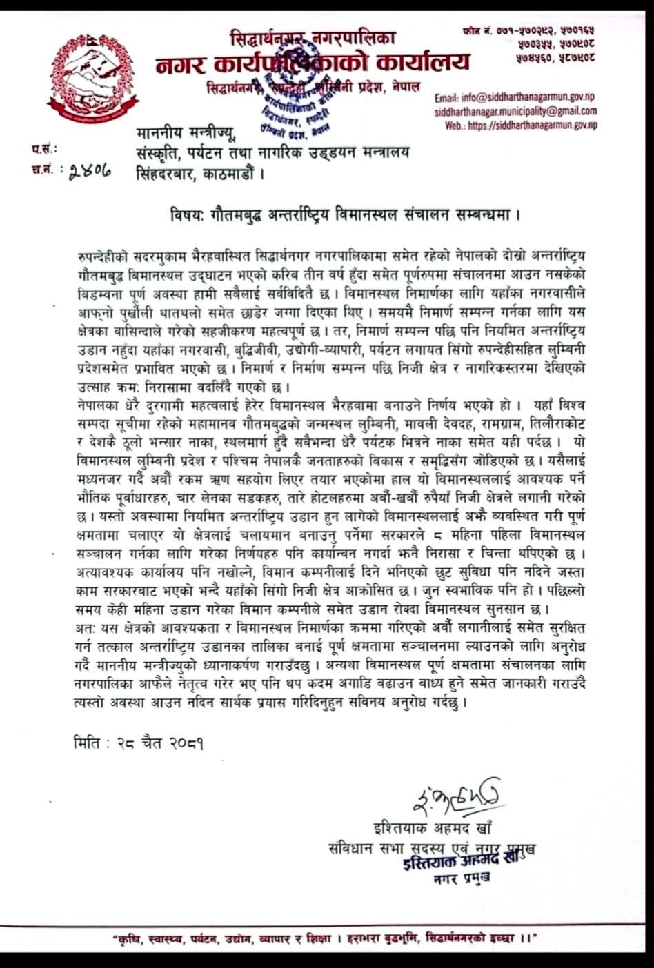 भैरहवा, २८ चैत । रुपन्देहीको सिद्धार्थनगर नगरपालिकाका नगर प्रमुख इश्तियाक अहमद खाँले संस्कृति, पर्यटन तथा नागरिक उड्डयन मन्त्री बद्रीप्रसाद पाण्डेलाई पत्राचार गर्दै भैरहवास्थित गौतमबुद्ध अन्तर्राष्ट्रिय विमानस्थल संचालनका लागि सार्थक एवं प्रभावकारी कदम चाल्न आग्रह गरेका छन् । उद्घाटन भएको तीन वर्ष पुग्नै लाग्दा समेत विमानस्थल पूर्णक्षमता संचालनमा आउन नसक्नु यस क्षेत्रका लागि दुःखद र पीडादायी रहेको उल्लेख गर्दै उनले शिघ्र अन्तर्राष्ट्रिय उडान नियमित गराउन मन्त्री पाण्डेको ध्यानाकर्षण गराएका हुन् ।