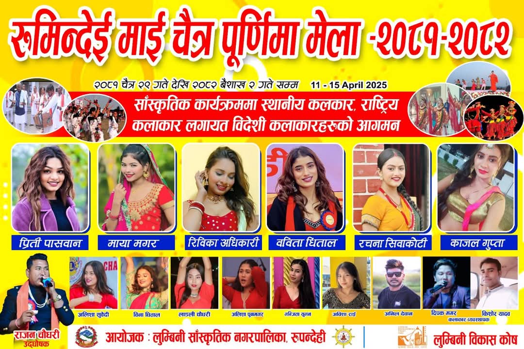 लुम्बिनी ,३१ चैत । धार्मिक तथा सांस्कृतिक सम्पदास्थल लुम्बिनीमा चैत्र पूर्णिमा मेला पाँच दिनसम्म मनाइँदैछ । लुम्बिनी सांस्कृतिक नगरपालिका आयोजनामा र लुम्बिनी विकास कोष सह आयोजना वडा –३ स्थित बुद्धजन्मस्थलमा परम्परागत चैत्र पूर्णिमा महोत्सव एवं रुमिन्देइमाई मेला यही चैत २९ गते शुक्रबारदेखि सुरु भएको हो । यो मेला वैशाख २ गतेसम्म जारी रहने छ ।