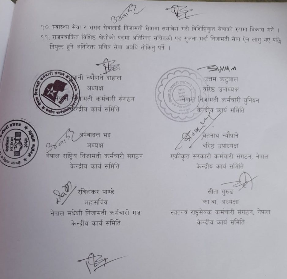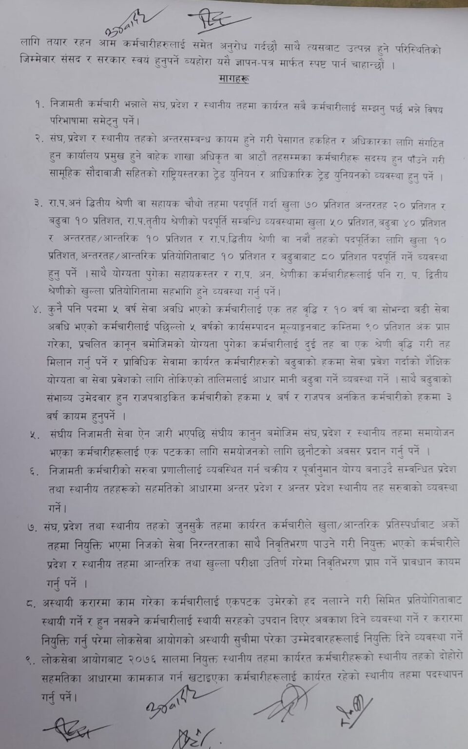 ज्ञापन पत्रमा सरकारले कर्मचारी संगठनहरुबीच यसअघि भएका सहमति र अदालतको आदेश कार्यान्वयन गर्न माग गरिएको छ।