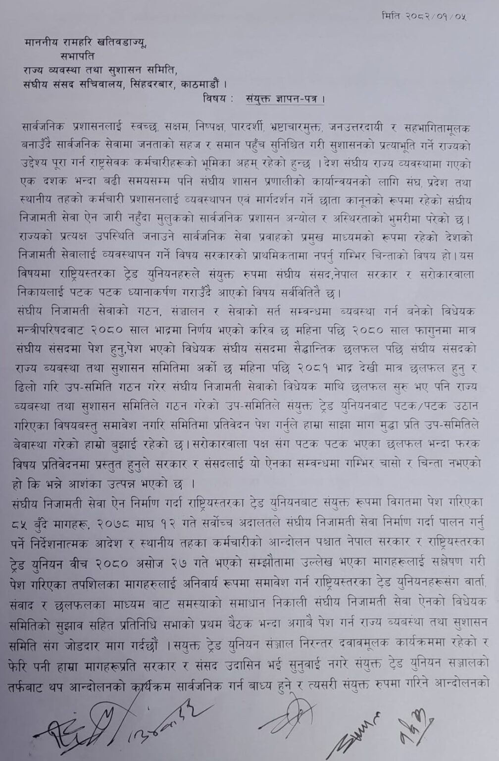 काठमाडौं ५ बैशाख। निजामती कर्मचारीका विभिन्न संघ तथा संगठनले संघीय निजामती ऐन जारी गर्नुपर्ने माग गर्दै संसदको राज्य व्यवस्था तथा सुशासन समितिका समितिका सभापति रामहरि खतिवडालाई आज ज्ञापनपत्र बुझाएका छन्।