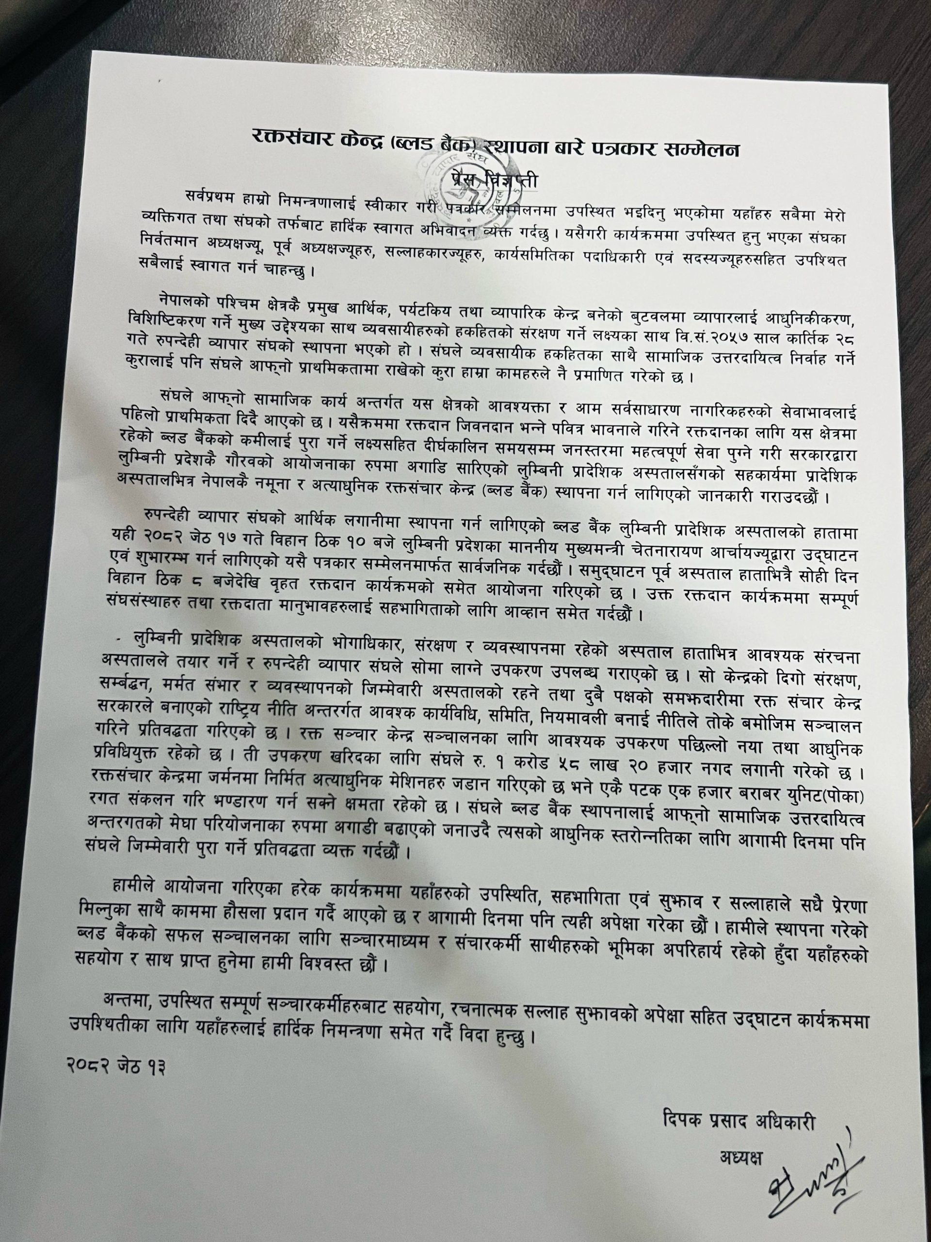 रुपन्देही व्यापार संघको आर्थिक लगानीमा स्थापना गर्न लागिएको ब्लड बैंक लुम्बिनी प्रादेशिक अस्पतालको हातामा यही २०८२ जेठ १७ गते विहान ठिक १० बजे लुम्बिनी प्रदेशका माननीय मुख्यमन्त्री चेतनारायण आर्चायबाट उद्घाटन एवं शुभारम्भ गर्न लागिएको अध्यक्ष अधिकारीले जानकारी दिए । समुद्घाटन पूर्व अस्पताल हाताभित्रै सोही दिन विहान ठिक ८ बजेदेखि वृहत रक्तदान कार्यक्रमको समेत आयोजना गरिएको छ । उक्त रक्तदान कार्यक्रममा सम्पूर्ण संघसंस्थाहरु तथा रक्तदाता मानुभावहरुलाई सहभागिताको लागि आव्हान समेत गरिएको छ ।