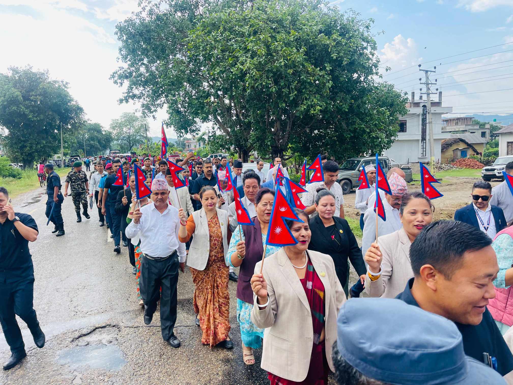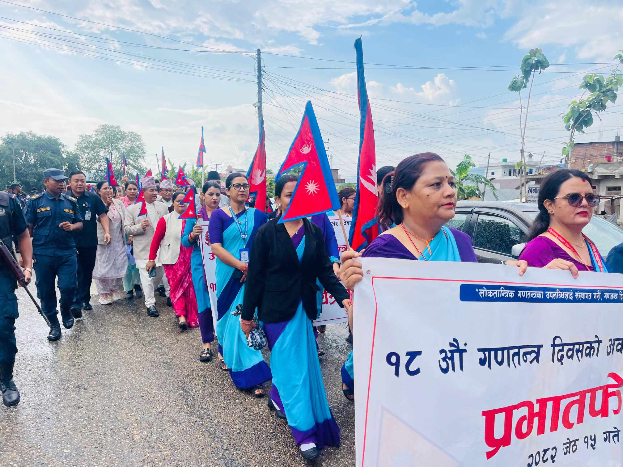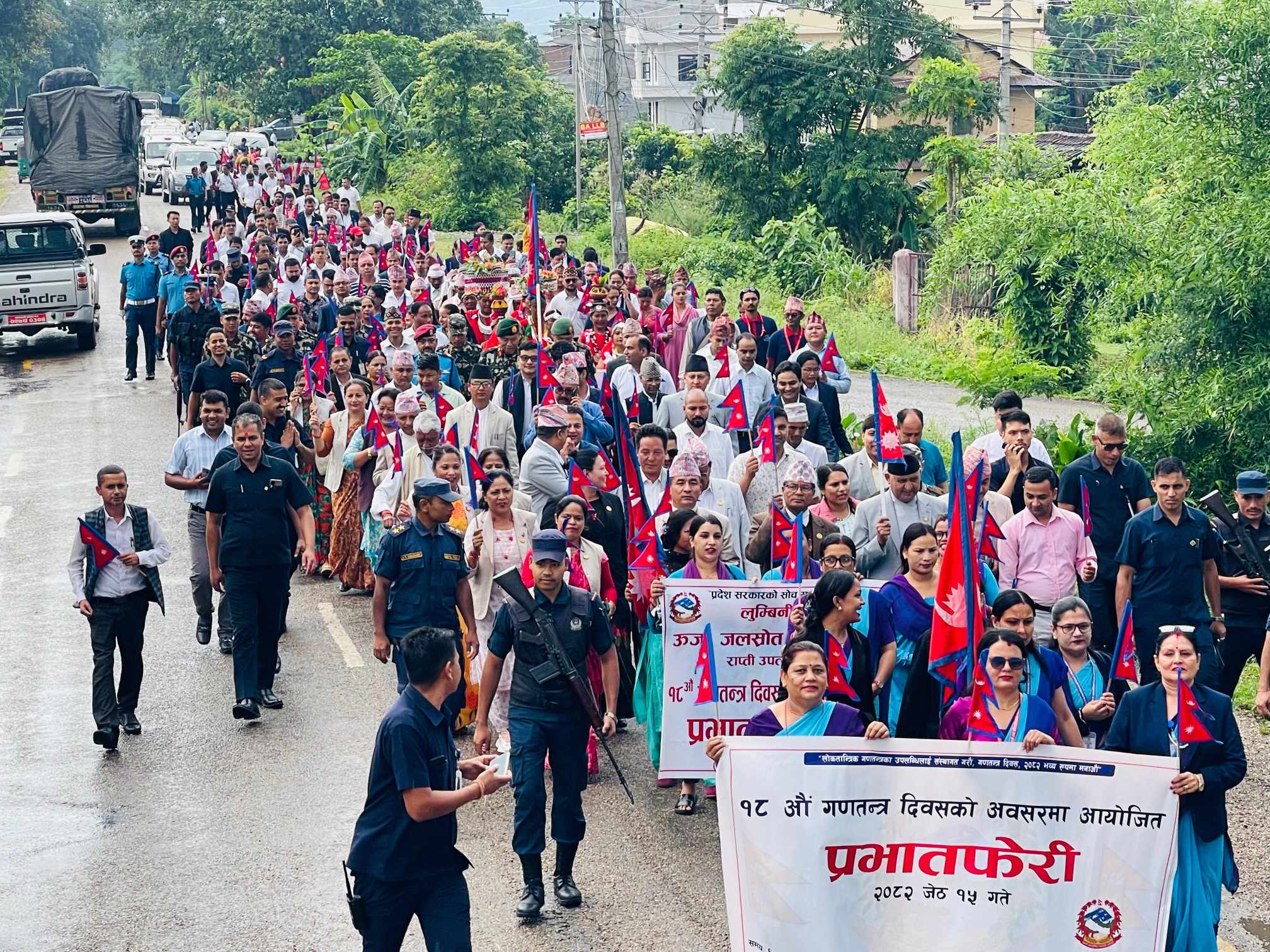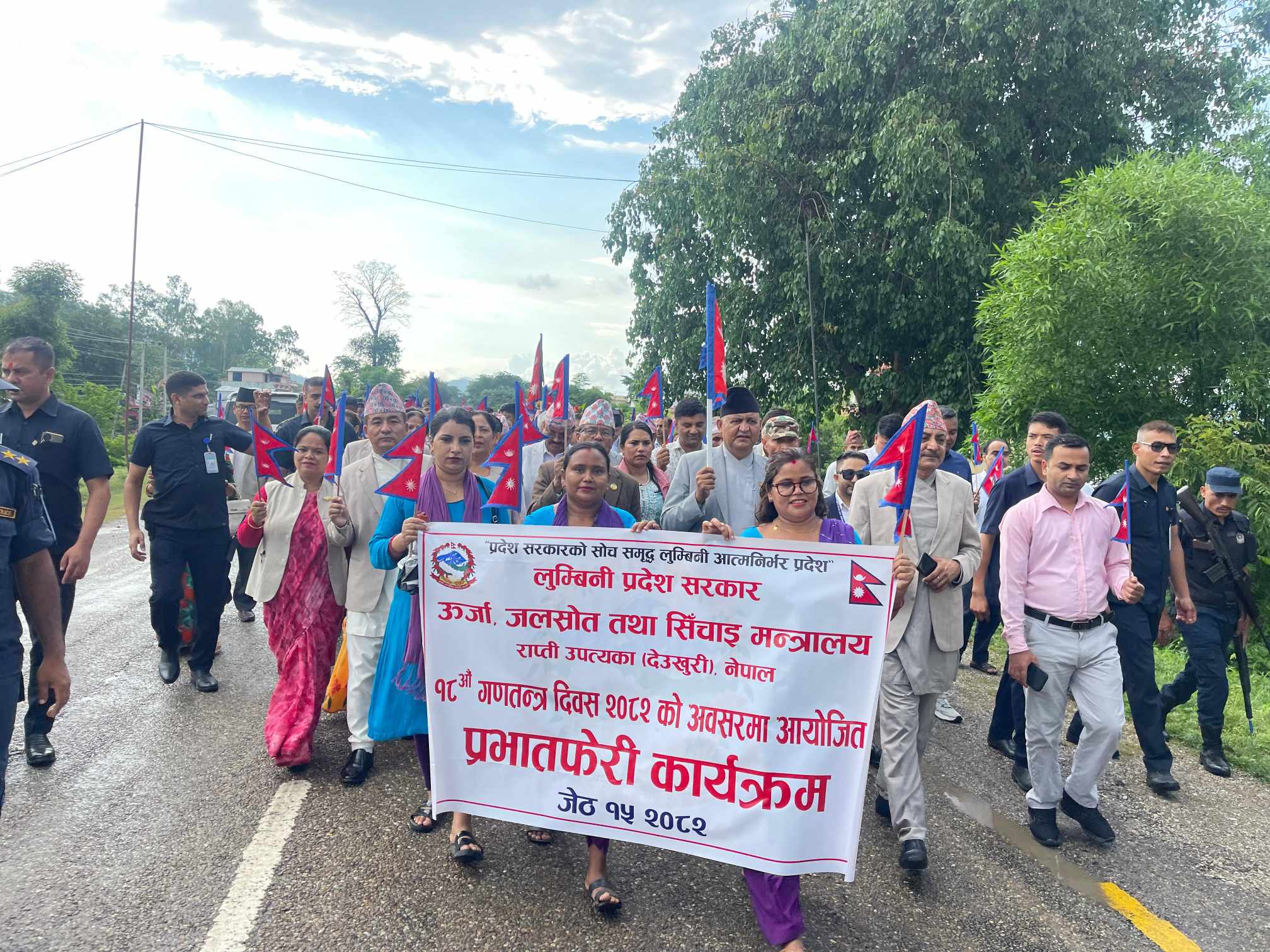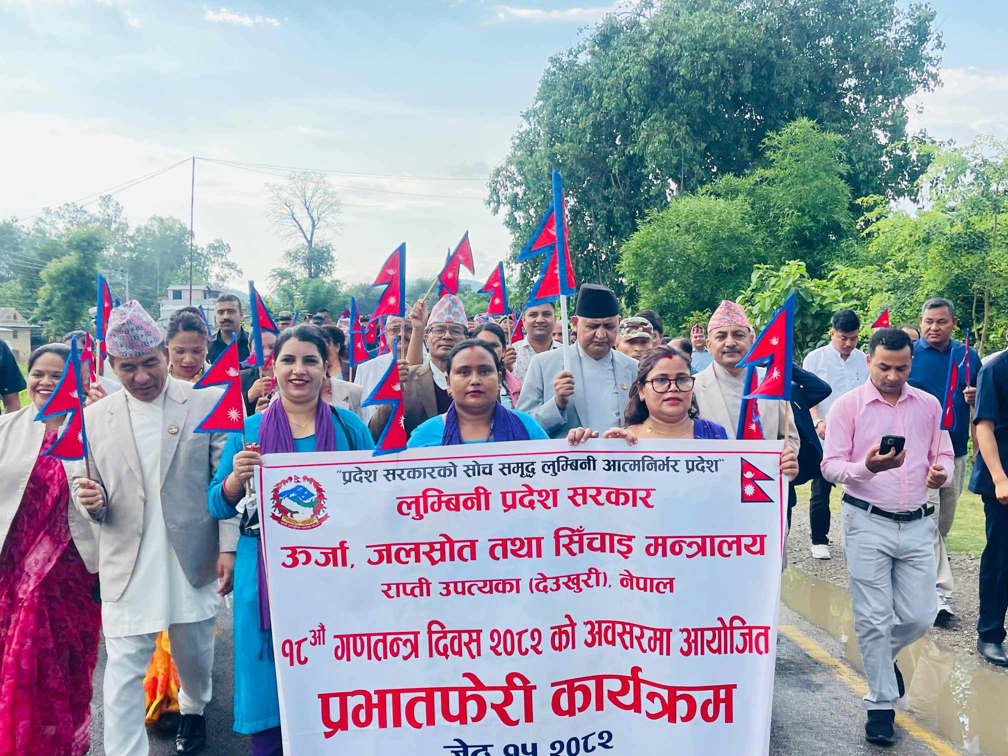 दाङ ,१५ जेठ । लुम्बिनी प्रदेश सरकारले १८ औं गणतन्त्र दिवस उत्सवको रूपमा मनाइरहेको छ। तीन दिनसम्म विविध कार्यक्रम आयोजना गरेर दिवस मनाउने गरी आज मुल समारोह आयोजना गरिएको छ । दिवसको अवसरमा विभिन्न कला, संस्कृतिसहितको झाँकी सम्मिलित प्रभातफेरीको आयोजना गरिएको छ । राप्ती गाउँपालिकाको परिसरबाट सुरु भएको प्रभातफेरी प्रदेश सभा पुगेर सभामा परिणत हुने छ ।स्थानीय कला, संस्कृति, समुदायको भेषभूषा र पञ्चे बाजासहितको प्रभातफेरी सुरु भएको छ । मुख्यमन्त्री चेतनारायण आचार्यसहित प्रदेश सभाका सभामुख, पूर्व मुख्यमन्त्रीहरू, मन्त्रीहरू, प्रदेश सभा सदस्यहरू, स्थानीय तहका जनप्रतिनिधि, सुरक्षा निकाय, कर्मचारी तथा आम समुदायको सहभागिता रहेको छ ।
