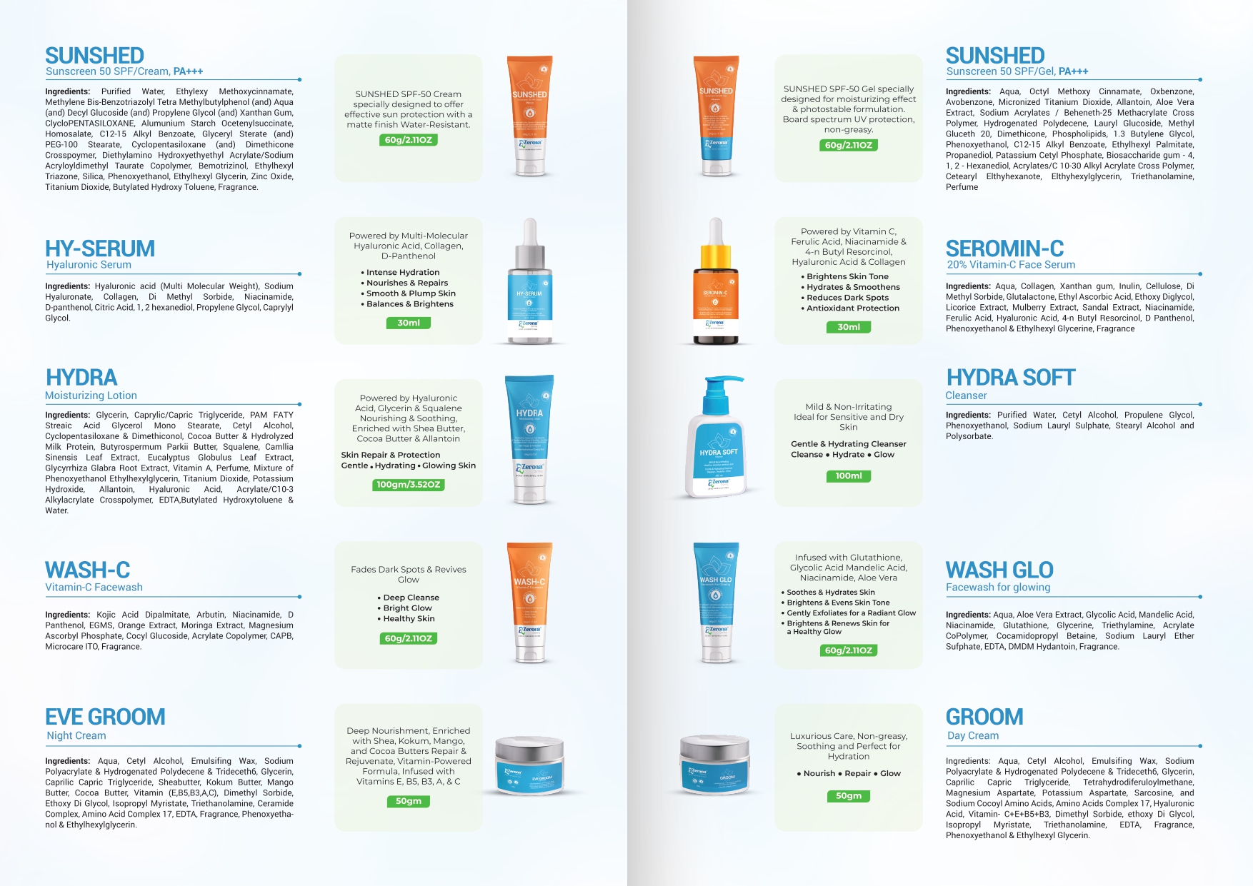कम्पनीले सनसेड नामको सनस्क्रिन ६० ग्राममा, एचवाई सेरम नामको हायलोरोनिक सेरम ३० एमएलमा, हाइड्रा नामक मोइस्चराइजीङ लोसन १०० ग्राममा, वाश सी नामको भिटामिन सी फेस वाश ६० ग्राममा तथा ईभ ग्रुम नामको नाइट क्रिम ५० ग्राममा ल्याएको छ। त्यस्तै सनशेड नामको सनस्क्रिन एसपीएफ फिफ्टी जेल ६० ग्राममा, सेरोमिन सी नामको भिटामिन सी फेस सेरम ३० एमएलमा, हाइड्रा सफ्ट नामको क्लिन्जर १०० एमएलमा, वाश ग्लो नामको ग्लोईङ फेसवास ६० ग्राममा, र ग्रुम नामको डे क्रिम ५० ग्राममा ल्याएको छ ।