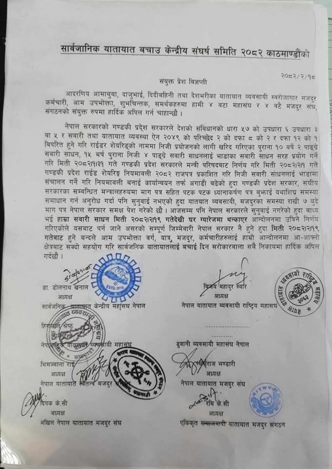 ‘सार्वजनिक यातायात बचाउ केन्द्रीय संघर्ष समिति’को विज्ञप्तिमा भनिएको छ, ‘यसबाट पर्न जाने असरको सम्पूर्ण जिम्मेवारी नेपाल सरकार नै हुने हुँदा मिति २०८२-०२-१९ गतेबाट हुने बन्दले आम उपभोक्ता वर्ग, यात्रु, मजदुर, कर्मचारीहरूलाई हाम्रो आन्दोलनमा आ-आफ्नो क्षेत्रबाट सक्दो सहयोग गरी सार्वजनिक यातायातलाई बचाई दिन सरोकारवाला सबै निकायमा हार्दिक अपिल गर्दछौँ ।’