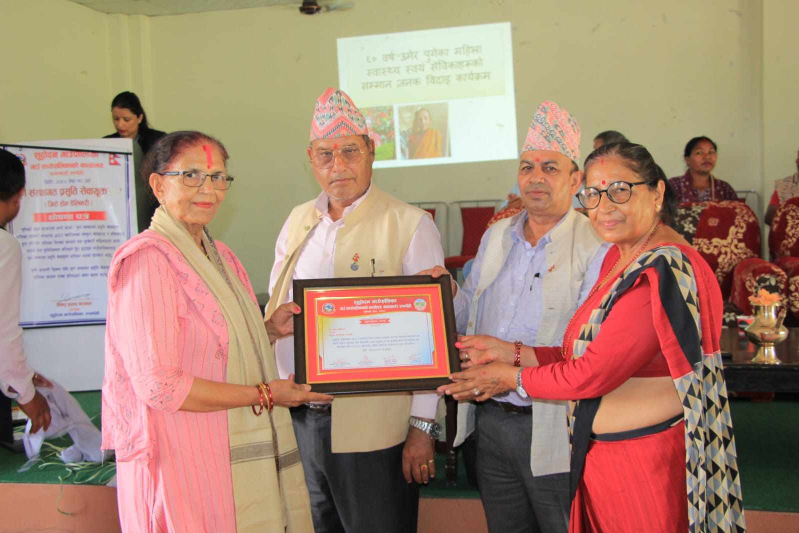 जिरो होम डेलिभरी।तथा पूर्ण खोप सुनिश्चितता पालिका घोषणा लाई पुर्ण सफलताका लागि खटिएका स्वास्थ्य शाखाका कर्मचारी वडाहरुका स्वास्थ्यकर्मी,महिला सोयमसेबिका जनप्रतिनिधि स्थानीय सबैलाई धन्यवाद दिनुभयो।र आगामी दिनहरूमा स्वास्थ्य क्षेत्रमा पालिकाले विशेषगरी ध्यानाकर्षण गर्ने र महिला सोयम सेविकाहरुको हितका लागि पहल गरिने बताउनुभयो।उक्त कार्यक्रममा गाउँपालिका उपाध्यक्ष शान्तादेवी ज्ञवाली,शुद्धोदन ४ का वडा अध्यक्ष तथा सामाजिक विकास समिति संयोजक केशव प्रसाद अधिकारी,वडा नम्बर ५ का वडा अध्यक्ष चन्द्रभान चौधरी,वरिष्ट खोप अधिकृत सुरेन्द्र सुवेदी स्वास्थ्य कायर्यालय प्रशाशन प्रमुख लक्ष्मी पौडेल अर्याल,W.H.D प्रतिनिधि प्रतिक्षा किसिजु लगायतले शुभकामना मन्तव्य दिनुभएको थियोे।कार्यक्रम संचालन स्वास्थ्य शाखामा कार्यरत सि.अ.न.मी, नि, सिर्जना पौडेलले गर्नुभएको थियोे।