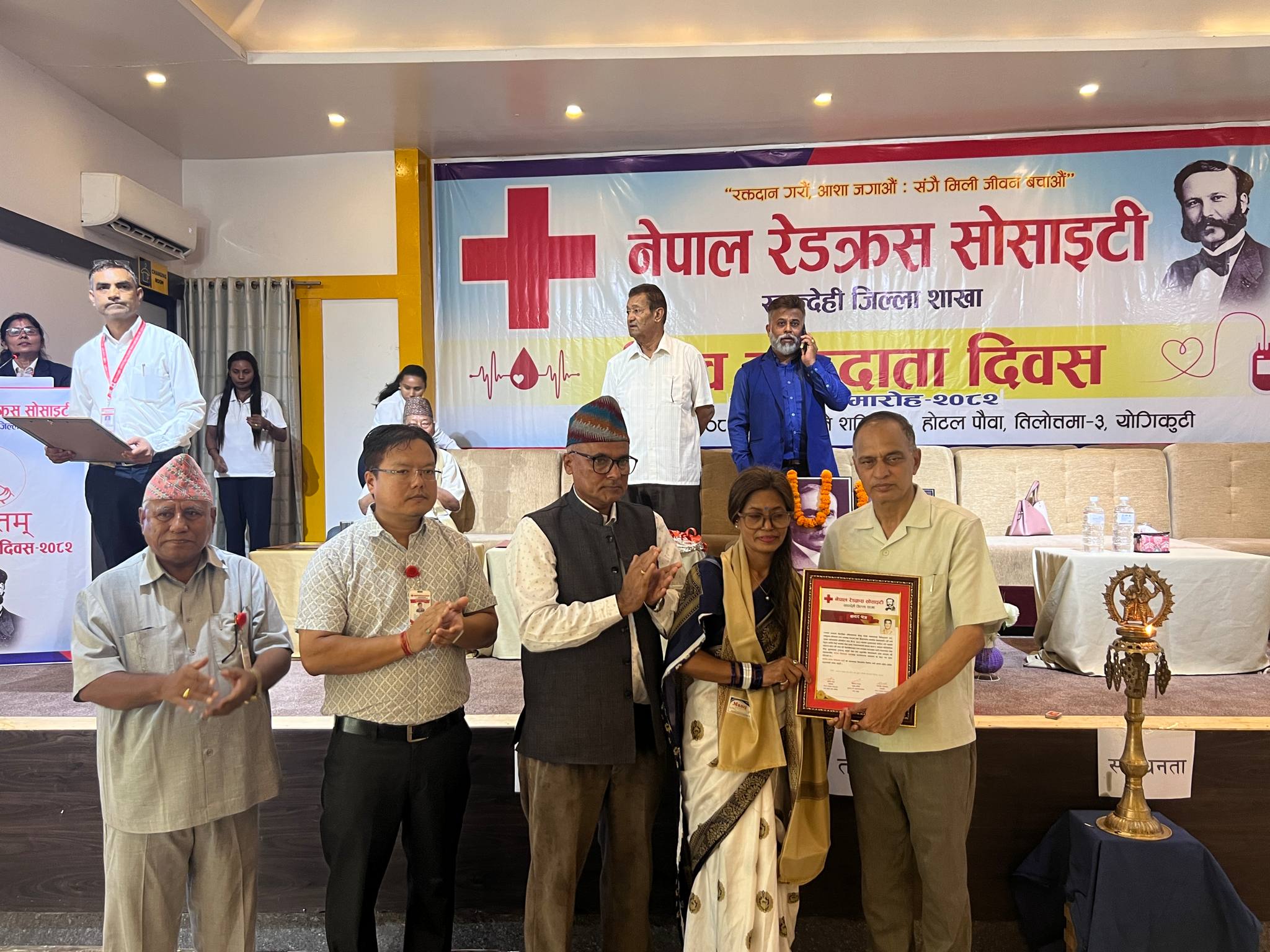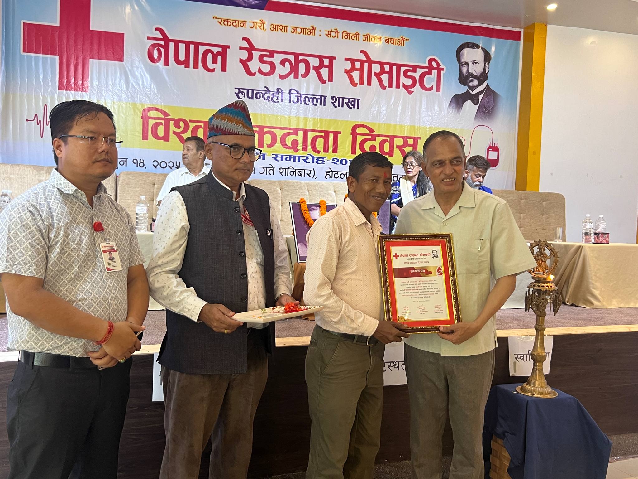 रक्तदान गरौं आशा जगाऔ संगै मिलि जीवन बचाऔं भन्ने नाराका साथ नेपाल रेडक्रस सोसाईटी रुपन्देही शाखाको आयोजनामा विश्व रक्तदाता दिवस २०८२को अवसरमा आयोजित रक्तदाता सम्मान कार्यक्रममा नियमित रक्तदान गर्नेलाई सम्मान गरिएको हो।