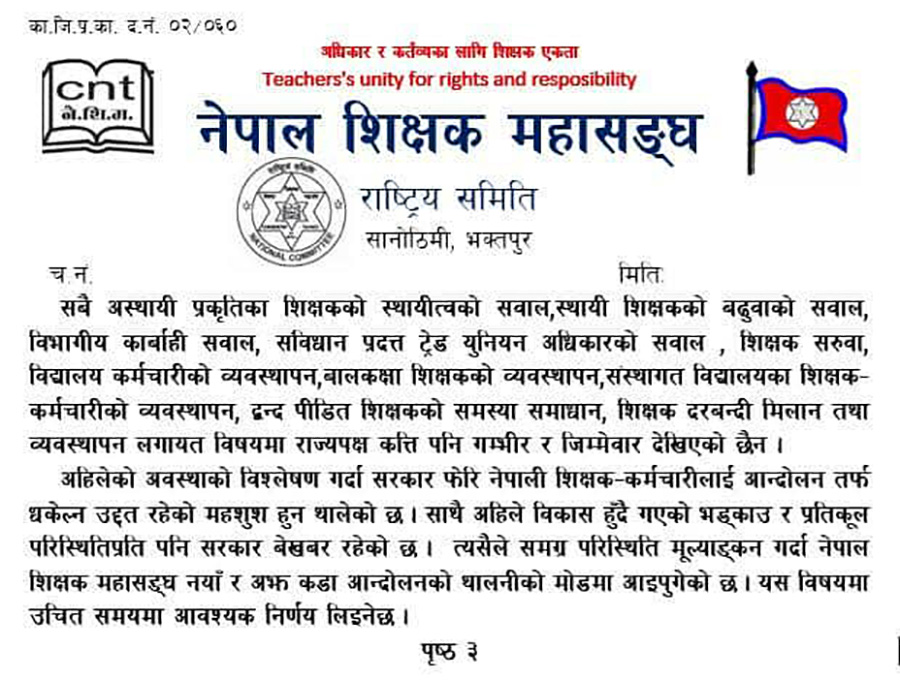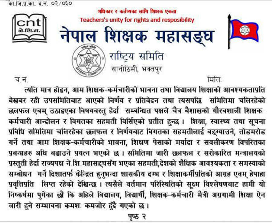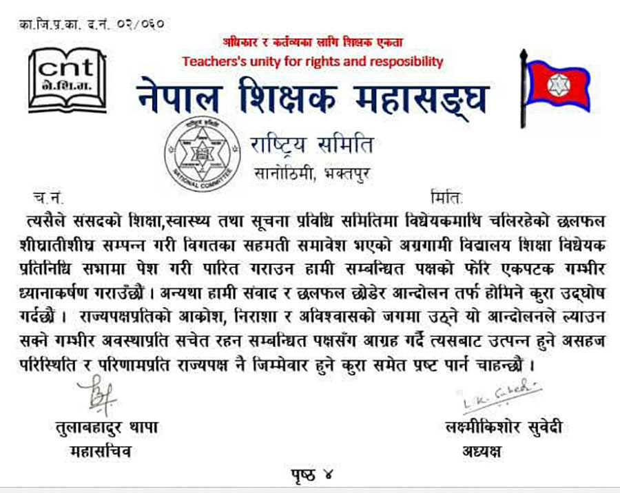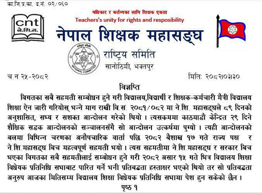 काठमाडौँ,३० असार ।नेपाल शिक्षक महासङ्घले सरकारले आफूसँग भएका विगतका सहमतिहरूलाई बेवास्ता गरी विद्यालय शिक्षा विधेयकमा शिक्षक-कर्मचारीमैत्री प्रावधानहरू समावेश गर्न नचाहेको आरोप लगाउँदै कडा आन्दोलनको चेतावनी दिएको छ। महासङ्घले यसअघि भएको ८९ दिने आन्दोलन र त्यसपछिका सहमतिको स्मरण गराउँदै सरकारले आफ्ना प्रतिबद्धता पूरा नगरेकोमा गम्भीर आपत्ति जनाएको हो। महासंघले २० चैतदेखि २९ दिन लामो सडक आन्दोलन गरेपछि ०८२ वैशाख १७ गते असार १५ गते भित्र विद्यालय शिक्षा विधेयक प्रतिनिधि सभाबाट पारित गर्ने सहमति भएको थियो । तर समयसीमाभित्र ऐन जारी नभएपछि महासंघले आन्दोलनको चेतावनी दिएको हो ।