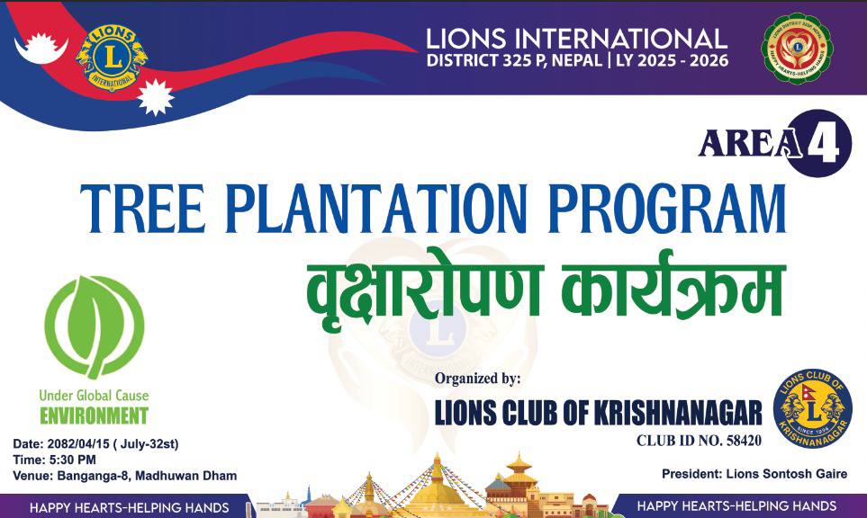 बुटवल ,१६ साउन । लायन्स क्लब अफ कृष्णनगरको आयोजनामा बाणगङ्गा नगरपालिका–८ स्थित मधुवनधाम परिसरमा वृक्षरोपण कार्यक्रम सम्पन्न ।