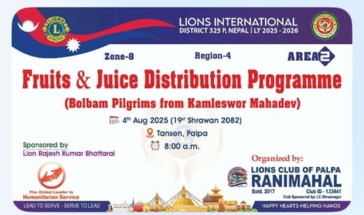 कार्यक्रमा पूर्व अध्यक्ष,तथा सदस्हरुको सहभीता रहेको थियो । लायन्स इन्टरनेशनलको हन्गर रिलिफ अन्र्तरगत करिव ५० जना तिर्थयात्रीहरुलाई फलफूल तथा जुस वितरण गरिएको कार्यक्रम संयोजक तथा नि बर्तामान अध्यक्ष राजेश कुमार भट्राईले जानकारी दिनुभयो । हामी सेवा गदछौ भन्ने मुल नाराका साथ सामाजिक कार्यमा सधैं अगाडि बढ्ने हाम्रो लक्ष्य नै भएको क्लबका सचिव डा. सौरभ श्रेष्ठले बताउनुभयो ।