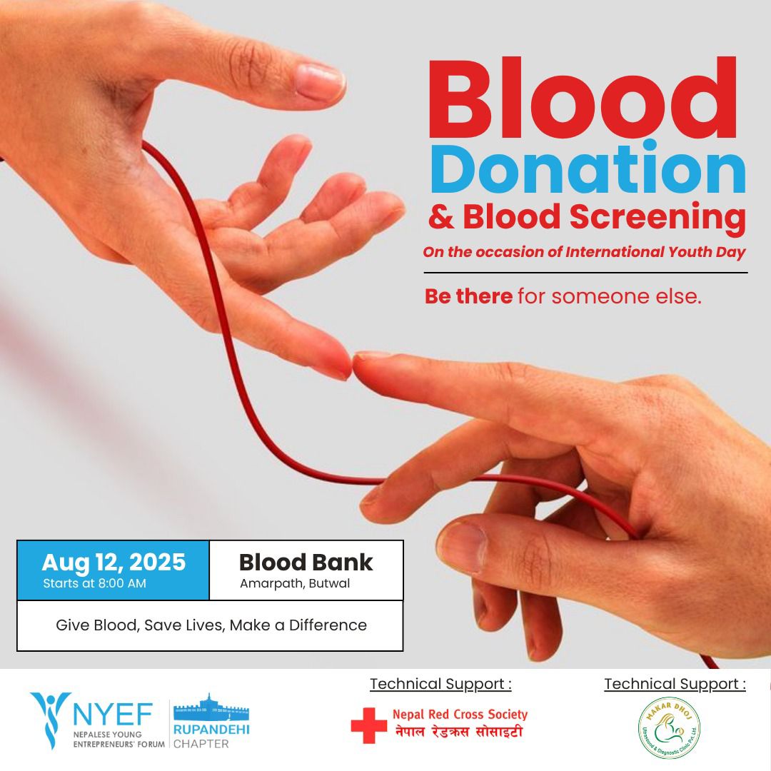 बुटवल,२८ साउन ।नेपाली युवा मञ्च रुपन्देही च्याटरलेले अन्तरास्ट्रिय युवा दिवस को अबसरमा रक्तदान तथा रक्त परिक्षण कार्यक्रम सम्पन्न गरेको छ । नेपाल रेडक्रस सोसाइटी बुटवल प्राविधिक सहयोगमा मकरधाेज अल्ट्रासाउन्ड एण्ड डाडनेस्टिस क्ल्निक प्रा लि मंगलबार बुटवलमा भएको रक्तदानबाट ५१ युनिट रक्त संकलन भएको मञ्चका रुपन्देहीका अध्यक्ष आर्दश श्रेष्ठले जानकारी दिए ।‘ रगत अभावमा कसैको पनि ज्यान नजाओस् भनेर सामाजिक उत्तरदायित्व बहन गर्दै कार्यक्रम आयोजना गरिएको हो’, उनले भने, ‘आगामी दिनमा निरन्तरता दिँदै जानेछ । यही क्रसममा रक्तदान जस्तो पवित्र कार्यक्रम गर्न पाउँदा खुशी लागेको श्रेष्ठले बताए । युवा उधमी मञ्चले हरेक वर्ष रक्तदान कार्यक्रम आयोजना गरी रगत अभावबाट गुज्रिएका नागरिकको ज्यान बचाउन सहयोग गर्दै आएको बताए । उनले रक्तदानले खासगरी मुटुलाई स्वस्थ बनाइराख्न सहयोग गर्ने र अरुको मुटुको ढुकढुकी कायम राख्न पनि स्वस्थ व्यक्तिले रक्तदान गर्न जरुरी रहेको बताए । रक्तदान कार्यक्रम तीन तीन महिनाको गरिने सयोजक अमन श्रेष्ठले बताए ।