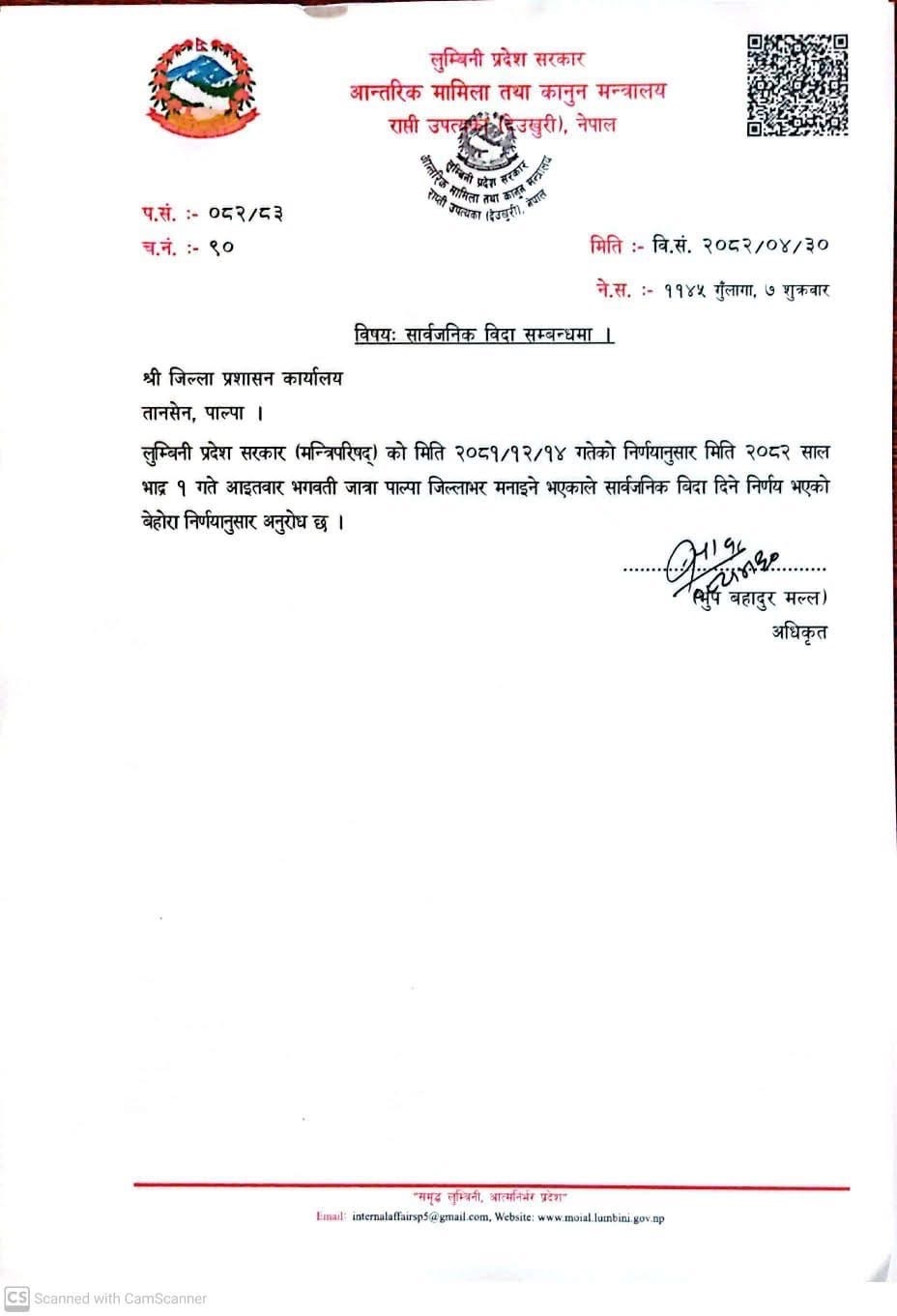 प्रदेश मन्त्रिपरिषद्को २०८१ साल चैत १४ गतेको निर्णय अनुसार सो दिन पाल्पामा भगवती जात्रा मनाइने भएकाले विदा दिने निर्णय गरिएको हाे । नेपाल र इस्ट इन्डिया कम्पनीबीच वि.सं. १८७१–७२ मा भएको युद्धमा नेपाली सेनाले प्राप्त गरेको ऐतिहासिक विजयको स्मरणमा प्रत्येक वर्ष भाद्र कृष्ण नवमीका दिन भव्य रूपमा भगवती जात्रा मनाउनेगरिएको छ ।