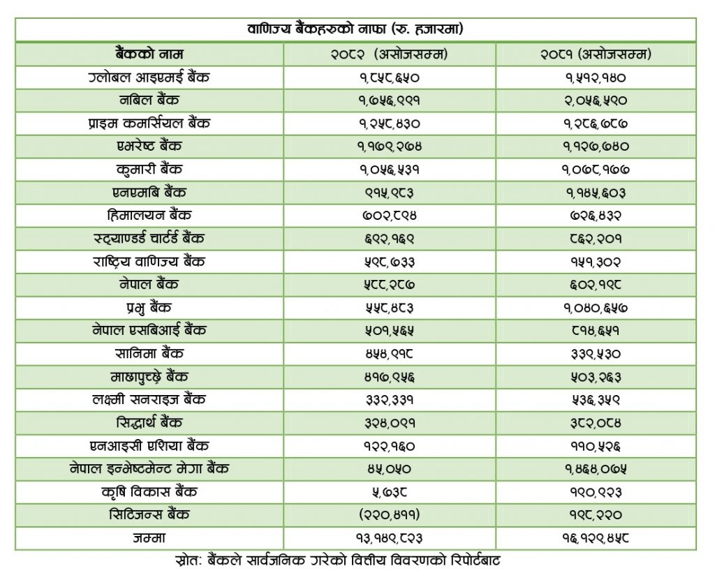 चालू आवको तेस्रो त्रैमाससम्म पाँच बैंक अर्ब क्लबमा पुगेका छन् । यो अवधिमा एक अर्ब भन्दा बढी नाफा कमाउनेहरूमा ग्लोबलसहित नबिल बैंक, प्राइम कमर्सियल बैंक, एभरेष्ट बैंक र कुमारी बैंक रहेका छन् ।