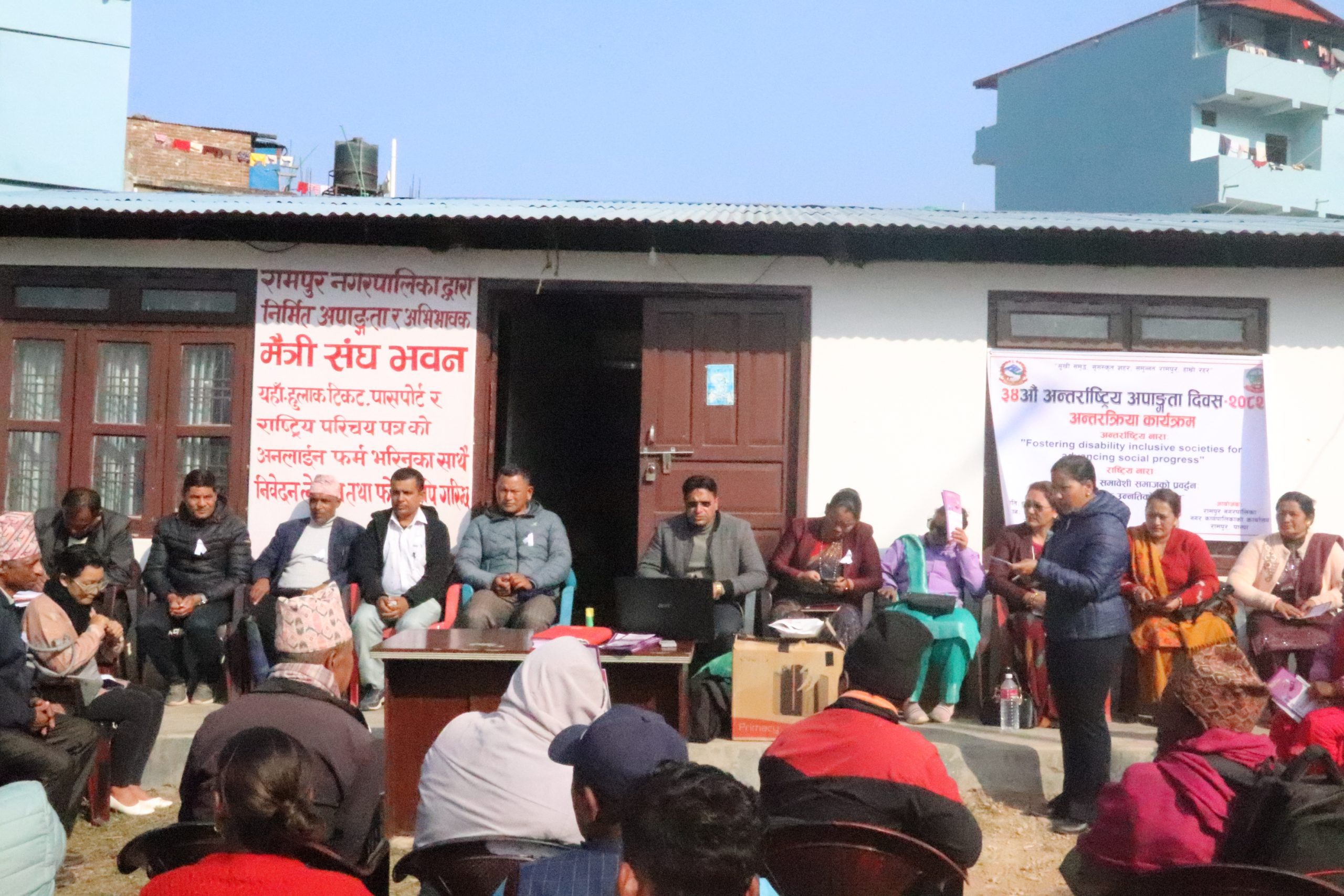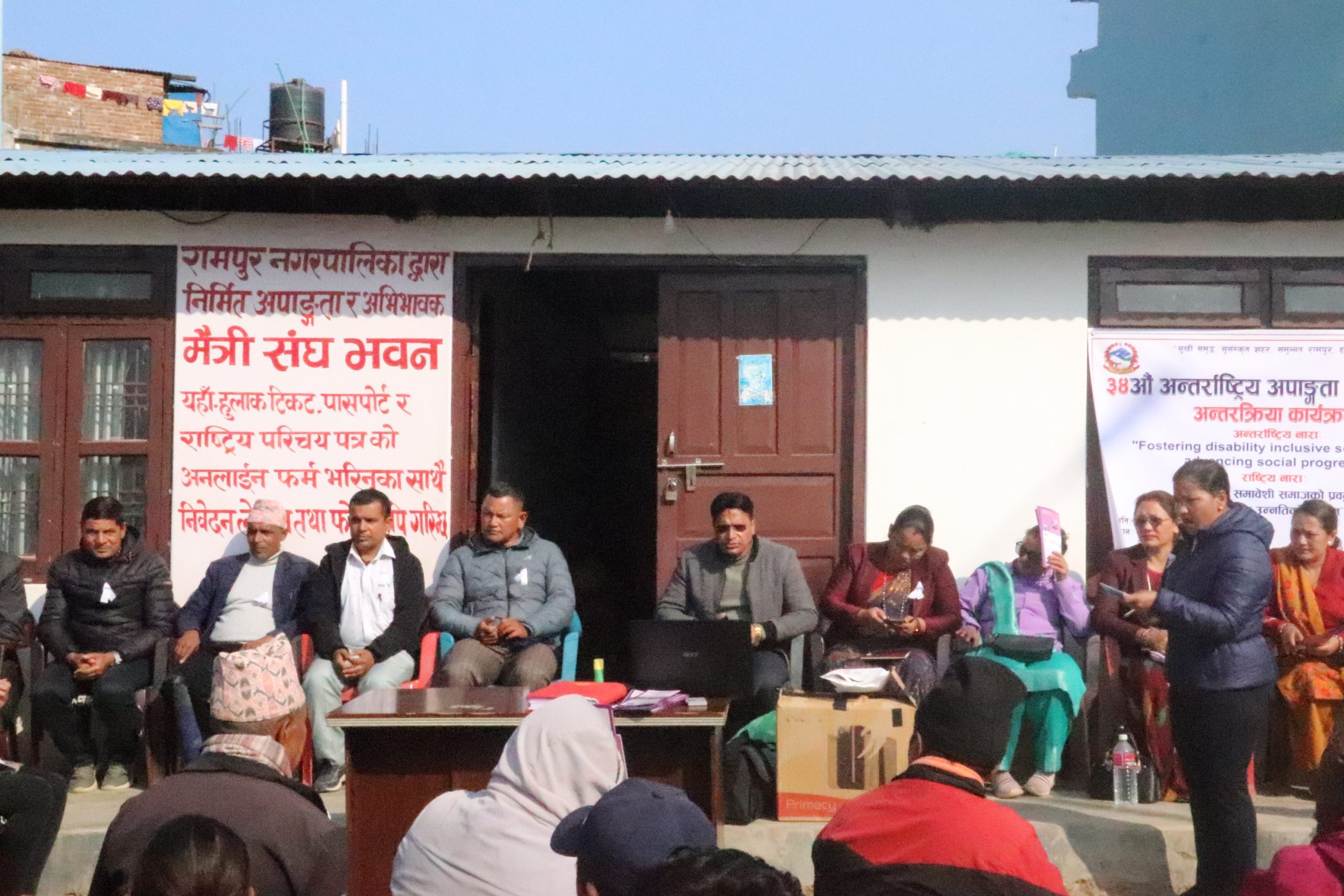 कार्यक्रममा रामपुर नगरपालिकाका प्रशासकीय अधिकृत युवराज पन्थीले अपाङ्गता भएका व्यक्तिहरुको हक अधिकारको सुनिश्चितता संगै संरक्षणका लागि सबैले ध्यान पुर्याउनु पर्नेमा जोड दिनुभयो ।साथै उहाँले अपाङ्गता भएका व्यक्तिहरुको हक अधिकार र कानुनी व्यवस्था सम्बन्धी विषयमा सहजिकरण गर्नु भएको थियो ।कार्यक्रमका अवसरमा श्रवण शक्ति कमजोर भएका १ जनालाई श्रवण सहायता सामग्री र ६ जना अपाङ्गता भएका व्यक्तिहरुलाई अपाङ्गता परिचयपत्र वितरण गरिएको छ । जसमध्ये एउटा रातो, २ वटा निलो र ३ वटा पहेँलो अपाङ्गता परिचय पत्र वितरण गरेको हो । रामपुर नगरपालिकाका उपप्रमुख बाल कुमारी थापाको अध्यक्षतामा भएको कार्यक्रमको सञ्चालन महिला तथा बालबालिका शाखा प्रमुख पुजा परियारले गर्नु भएको थियो । अपाङ्गता र अभिभावक मैत्री संघ रामपुरको भवन प्राङ्गण रामपुर बेझाँडमा भएको कार्यक्रममा नगर भित्रका फरक क्षमता भएका व्यक्तिहरुको सहभागिता रहेको थियो ।