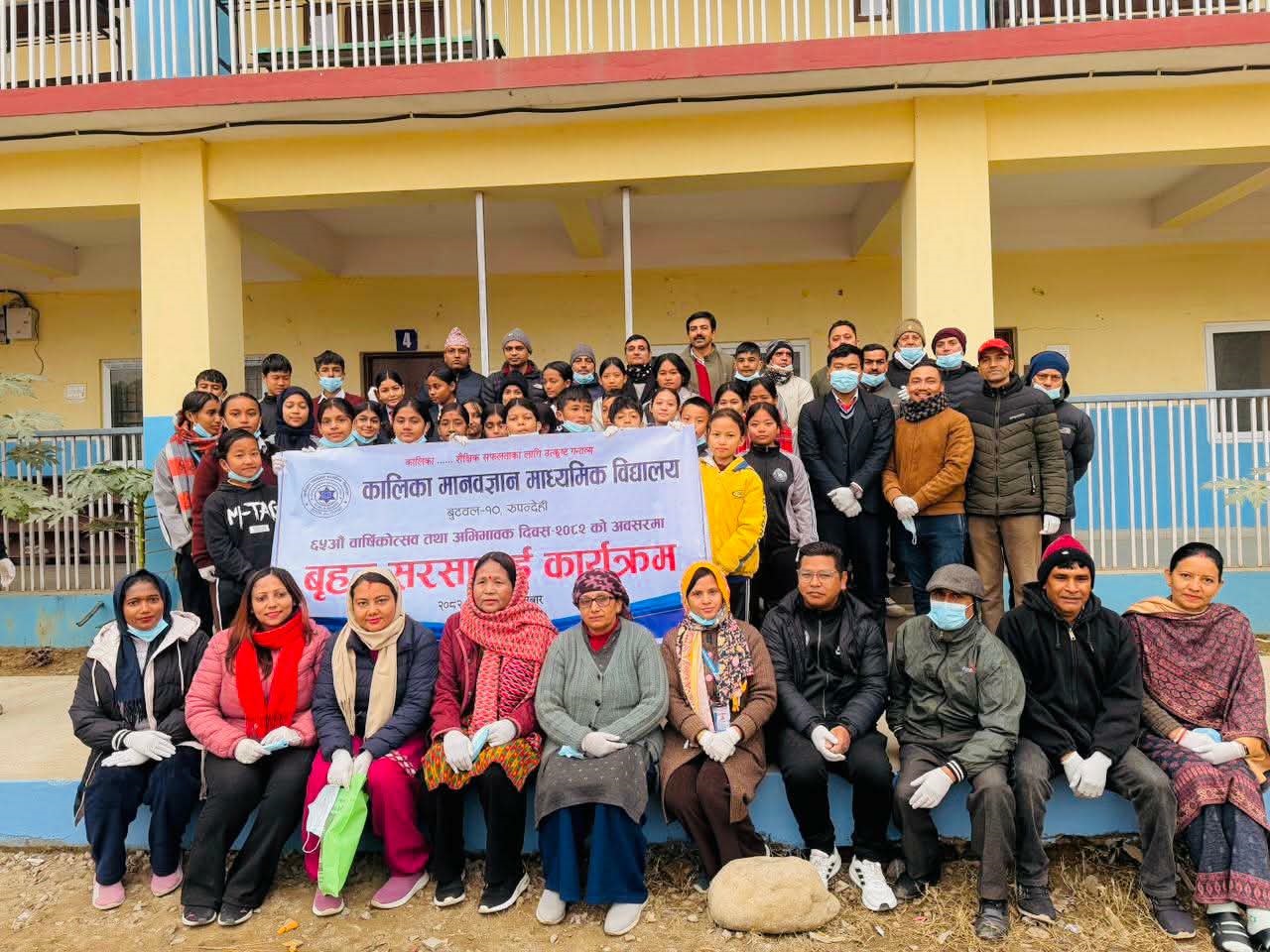 बुटवल, ५ पुस । विद्यालयको ६५ औँ वार्षिकोत्सवको अवसरमा विद्यालयको सामाजिक उत्तरदायित्व अन्तर्गत आज पौस ५ गते शनिबार विद्यालयका शिक्षकहरु, प्रतिनिधि विद्यार्थीहरु र समुदायका समाजसेवि, टोल समितिका अध्यक्ष एवम् प्रतिनिधिहरुको सहभागितामा विद्यालय समुदाय सरसफाई कार्यक्रम सम्पन्न भएको छ । उक्त कार्यक्रम विद्यालयको दुबै सेक्टरमा भएको छ । सेक्टर २ मा भएको कार्यक्रममा बुटवल उ म न पा वार्ड न १० का जनप्रतिनिधि एवम् वि व्य स सदस्य श्री यमुना काउचा, वि व्य स सदस्य शान्ता गौतम, समाजसेवि टंक कुमार खडका, दिलिप सुनार, विद्यालयका स प्र अ विष्णुहरि ज्ञवाली लगायत शिक्षक एवम् विद्यार्थीहरुको उपस्थिति रहेको थियो । सरसफाई कार्यक्रम अन्तर्गत विद्यालयसँग प्रत्यक्ष रुपमा जोडीएको रामनगर परिसर र विद्यालय परिसर सरसफाई गरिएको कुरा विद्यालयका इन्चार्ज कृष्ण गौतमले जानकारी दिनुभयो ।