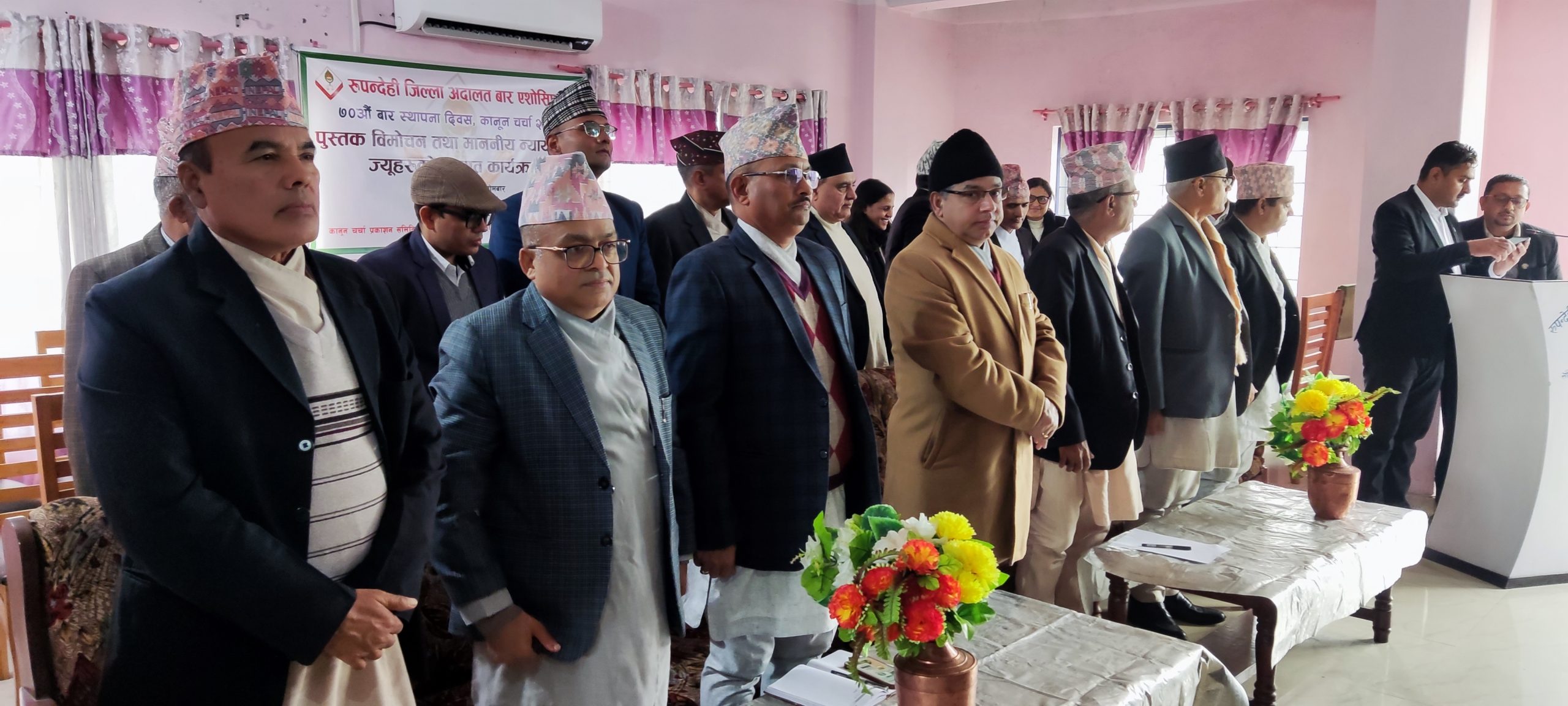 नेपाल बार एशोसीएसनको ७० औं बार स्थापना दिवसको अवसरमा सोमबार रुपन्देही जिल्ला बार एशोसियशनले बार स्थापना दिवस कानुन चर्चा २०८२ पुस्तक विमोचन तथा रुपन्देहीमा आगन्तुक नयाँ न्यायाधिशहरुको स्वागत तथा सम्मान बधाई कार्यक्रम सम्पन्न गरेको छ ।