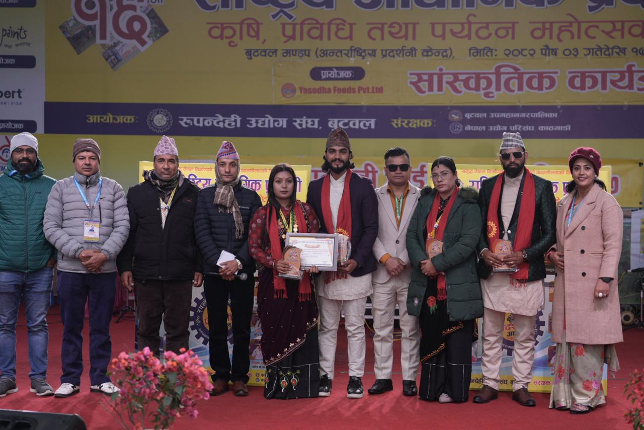 बुटवल,,१५ पुस। बुटवलमा जारी १६ औं राष्ट्रिय औद्योगिक प्रदर्शनी, कृषि, प्रविधि तथा पर्यटन महोत्सवको प्रदर्शनीमा सांस्कृतिक कार्यक्रमको मुख्य आकर्षण रहेको लोकदोहोरी प्रतियोगिताको उपाधि खस्यौली रोधी घर बुटवलले जितेको छ । पुस ३ गतेदेखि संचालन भएको प्रदर्शनीमा मंगलबार भएको फाइनलमा उसले उपाधि जितेर ८८ हजार ८ सय ८८ रुपैयाँसहित प्रमाणपत्र पाएको सांस्कृतिक उपसििमतका संयोजक लालप्रसाद बस्यालले जानकारी दिनुभयो । त्यसैगरी दोस्रोमा दोहोरी गीत प्रतिष्ठान लुम्बिनी प्रदेश, तेस्रोमा दोहोरी गीत प्रतिष्ठान पाल्पा, सान्तवना दोहोरी गीत प्रतिष्ठान रुपन्देही भएको उहाँले जानकारी दिनुभयो । दोस्रोले ४४ हजार ४ सय ४४, तेस्रोले २२ हजार २ सय २२ र सान्त्वनाले ११ हजार १ सय ११ रुपैयाँ रकम हात पारेका हुन् । त्यसैगरी खुला राष्ट्रिय लोकभजन प्रतियोगितामा प्रथम पन्चायन भजन मण्डली सैनामैना, दोस्रोमा कलौनी कान्तिपुर बोर्डिङ सैनामैना र राष्ट्रिय लोकभजन चुट्का संरक्षण प्रतिष्ठान सुनवल, तेस्रोमा जनकल्याणकारी भजनकृतन समूह शुद्धोधन २ हिरापुर र देवदह भजनकृतन समूह् रुपन्देही तथा सान्तवनातर्फ संगम प्रगति भजन समुह सैनामैना, कालमोचन शिवालय रामापुर सैनामैना, राष्ट्रिय लोकभजन चुट्का संरक्षण प्रतिष्ठान बुटवल, दुर्गा पन्चायन मन्दिर भजन समूह कोटिहवा तिलोत्तमा, सिद्देश्वर शिवालय मन्दिर बुटवल ७ भएको संयोजक बस्यालले जानकारी दिनुभयो ।
