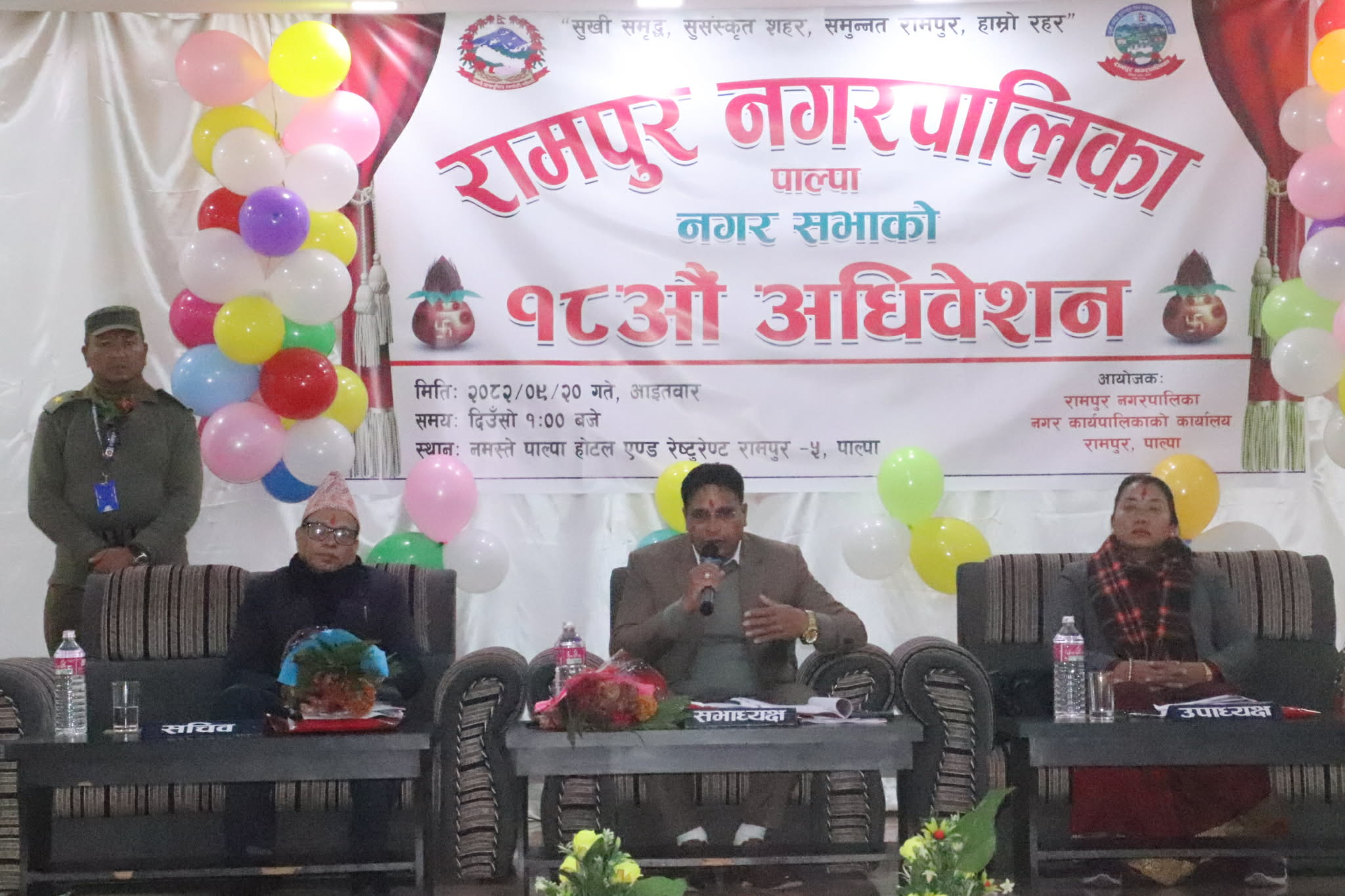 नमस्ते पाल्पा होटलको सभाहलमा भएको सभामा नगर सभाका सदस्य तथा विद्येयक समितिका संयोजक मिन बहादुर सिंजालीले प्रस्तुत गर्नु आर्थिक कार्यविधि तथा वित्तीय उत्तरदायित्व विधेयक २०८२ र विद्येयक सदस्य विष्णु माया गैरे प्रस्तुत गर्नु भएको रामपुर नगरपालिका पर्यटन विकास विधेयक सर्वसम्मत रुपमा पारित गरेको छ । नगर सभा सदस्यहरुले उठाएको प्रश्न र प्रस्ताव बारे प्रष्ट पार्दै सभाध्यक्ष एवं नगर प्रमुख रमण बहादुर थापाले विकास संगै नगरको पहिचानका लागि नगरपालिकाले गरेका कार्य गौरवको रुपमा रहेको बताउनुभयो । रामपुर नगरपालिकाले सुरुवात गरेको असल अभ्यास संघ र प्रदेशले पनि सुरुवात गर्नु खुशीको कुरा भएको बताउनुभयो । नगरपालिकाले खर रहितको घर, युवा स्वरोजगार, ढल रहित शहर, कालीगण्डकी पैदल मार्ग निर्माण, नगर गौशाला निर्माण, उज्यलो शहर घोषणा लगाएतका महत्वपूर्ण कार्य गर्दै आएको बताउनुभयो । उहाँले बालबालिका र जेष्ठ नागरिकको सुरक्षाका लागि रामपुर नगरपालिकाले आवश्यक कार्यक्रम सञ्चालन गर्दैै आएको बताउनुभयो ।जनताको चाहाना अनुसार स्रोत साधनले भ्याए सम्म विकास र सेवालाई प्राथमिकता दिदै आएको बताउनुभयो । जनप्रतिनिधि र कर्मचारीहरु जनतालाई सहज रुपमा सहज रुपमा सेवा प्रवाह गर्न कसरी सकिन्छ भन्ने ध्येयका साथ लागि रहेको बताउनुभयो । नगरपालिकाले संघ र प्रदेश संग समन्वय गर्दै लागि रहेको बताउनुभयो । उहाँले हल्लाको पछि नभै सेवामा प्रतिवद्ध भएर लाग्न अनुरोध गर्नुभयो । नगर उपप्रमुख बालकुमारी थापाले नगरको चालु आर्थिक वर्षको कुल बजेट ८१ करोड १३ लाख ६६ हजार ६२१ रुपैयाँ मध्ये अधिवेशनले वडा तथा नगर स्तरीय ८० वटा योजना तथा कार्यक्रमको दुई करोड पाँच लाख ११ हजार शीर्षकान्तर तथा रकमान्तर गरिएको जानकारी दिनुभयो । रामपुर नगरपालिका १ का वडा अध्यक्ष एवं प्रवक्ता कपिल बहादुर खाँणले सभामा धन्यवाद ज्ञापन गर्नु हुँदै देश वर्तमान अवस्था सम्म ल्याउनका लागि दलहरुको भुमिका महत्वपूर्ण रहेको बताउनुभयो । उहाँले जनप्रतिनिधिहरु स्थानीय तहलाई प्राप्त २२ वटा एकल अधिकार र १५ वटा साझा अधिकार कार्यान्वयनमा कति जिम्मेवार भएर लाग्यौं त्यो महत्वपूर्ण हुने बताउनुभयो । नगरबासीले के अनुभूति गरे भन्ने विषयमा समिक्षा गरी अघि बढ्नु आवश्यक रहेको बताउनुभयो । रामपुर नगरपालिकाका कार्यपालिका सदस्य दुर्गा देवी भण्डारी गौतमले योजना कार्यान्वयनमा सबैको साथ सहयोग आवश्यक रहेको बताउनुभयो । रामपुर नगरपालिका–३ का वडा अध्यक्ष दामोदर पाठक विकृति र विसंगति विरुद्ध एकजुट भएर लाग्नु पर्ने बताउनुभयो । शुन्य समयमा आफ्नो धारणा राख्दै वडा नं. १० का वडा अध्यक्ष तोयानाथ सारु थापाले नगरपालिकाले सञ्चालन गरेका राम्रो यो