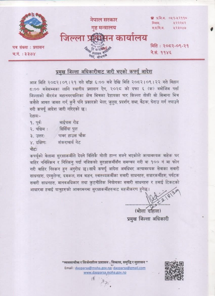 वीरगञ्ज,२१ पुस। पर्साको वीरगञ्जमा सुरक्षा स्थिति संवेदनशील बन्दै गएपछि जिल्ला प्रशासन कार्यालयले कर्फ्यु आदेश जारी गरेको छ ।