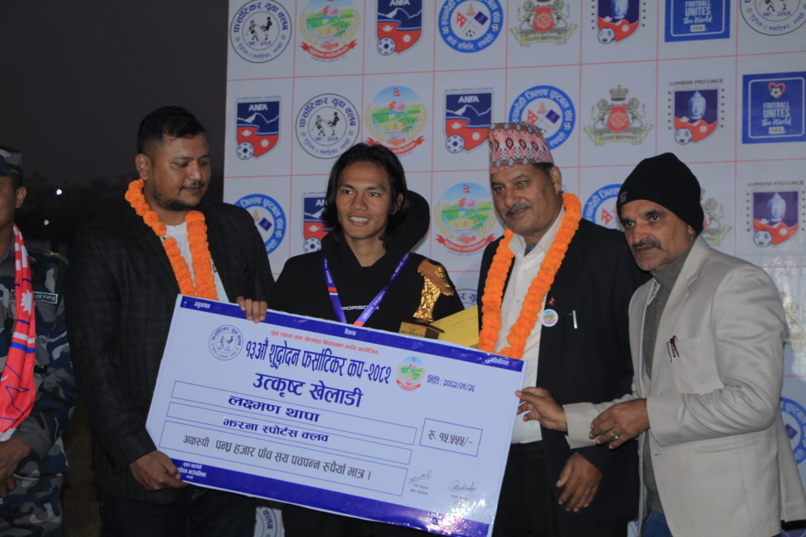१३ औं शुद्वोदन गाउँपालिका फर्साटिकर कपको उत्कृष्ट खेलाडी झरना स्पोर्ट्स क्लबका लक्ष्मण थापा घोषित भएका जसले नगद १५ हजार ५ सय ५५ रुपैया प्राप्त गरे । त्यसै गरि सर्वाधिक गोलकर्ता झरना स्पोर्ट्स क्लबका सुरज चौधरीले नगद १० हजार ५ सय प्राप्त गरे भने सोही क्लबकै खेलाडी टप बहादुर रानाले उत्कृष्ट गोल रक्षक हुन सफल भए बापत नगद १० हजार ५ सय रुपैया प्राप्त गरे।समापन कार्यक्रममा कार्यक्रमका प्रमुख अतिथि शुद्वोदन गाउँपालिका अध्यक्ष बिष्णु प्रसाद बस्यालले फर्साटिकर युवा क्लबको आयोजनामा हरेक बर्ष संचालन हुँदै आएको खेल प्रतियोगिताले शुद्वोदन गाउँपालिकालाई रास्टिय तथा अन्तर्राष्ट्रिय खेल जगतमा पहिचान गराउन सफल भएको बताउनु भयो ।साथै उहाँले गाउँपालिका सदैव खेलकुद विकास ,युवाको क्षमता अभिवृद्धि र स्वस्थ समाज निर्माणको लागि प्रतिबद्धता रहेको बताउनु भयो।