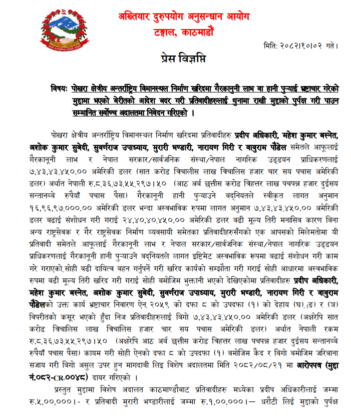 काठमाडौँ,२ माघ । पोखरा क्षेत्रीय अन्तर्राष्ट्रिय विमानस्थल निर्माणका क्रममा भ्रष्टाचार गरेको अभियोग लागेका आरोपितहरूलाई विशेष अदालतले कम धरौटी र साधारण तारेखमा छाडेको भन्दै अख्तियार दुरुपयोग अनुसन्धान आयोग सर्वोच्च अदालत पुगेको छ । अख्तियारले शुक्रबार सर्वोच्चमा निवेदन दिँदै विशेष अदालतको आदेश बदर गरी प्रतिवादीहरूलाई थुनामै राखेर मुद्दाको पुर्पक्ष गर्न माग गरेको हो ।विशेष अदालत काठमाडौँले गत मंसिर र पुसमा गरेको थुनछेक आदेश त्रुटिपूर्ण रहेको दाबी अख्तियारले गरेको छ । विशेष अदालतले प्रतिवादी प्रदीप अधिकारीलाई ५ लाख र मुरारी भण्डारीलाई १ लाख रुपैयाँ धरौटीमा छाड्न आदेश दिएको थियो भने अशोककुमार सुवेदी, सुवर्णराज उपाध्याय, महेशकुमार बस्नेत, नारायण गिरी र बाबुराम पौडेललाई साधारण तारेखमा रिहा गरेको थियो । अख्तियारले यी सबै आरोपितलाई विशेष अदालत ऐन, २०५९ को दफा ७ ९ङ० बमोजिम थुनामै राखेर मुद्दा अघि बढाउन माग गरेको छ ।