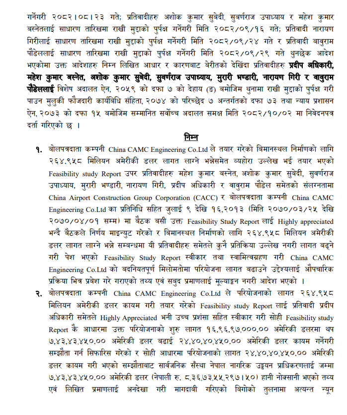 विमानस्थलको निर्माण कम्पनी चाइना सीएएमसी कम्पनी लिमिटेडले तयार गरेको विमानस्थल निर्माणका लागि २६ करोड ४९ लाख ५८ हजार अमेरीकी डलर लागत लाग्ने सम्भाव्यता अध्ययन रिपोर्टलाई महेशकुमार बस्नेत, अशोककुमार सुवेदी, सुवर्णराज उपाध्याय, मुरारी भण्डारी, नारायण गिरी, प्रदीप अधिकारी र बाबुराम पौडेलसमेतले हाइली एप्रिसिएटेड भनी माइन्युट गरेको आरोप उनीहरूमाथि छ ।