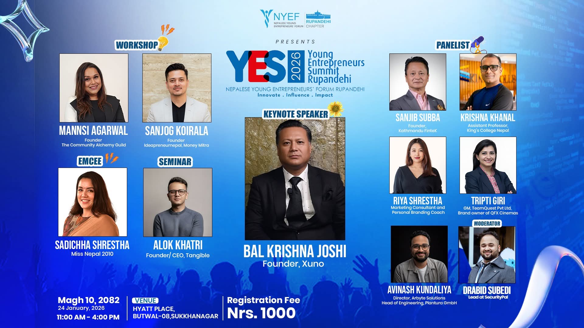 सम्मेलनमा प्रमुख अतिथिको रुपमा बुटवल उपमहानगरपालिकाका मेयर खेलराज पाण्डे आउनुहुनेछ । कीनोट स्पिकरको रुपमा Xuno का संस्थापक बालकृष्ण जोशीले उद्यमशीलता सम्बन्धी आफ्नो विशेष प्रस्तुती दिनुहुनेछ ।