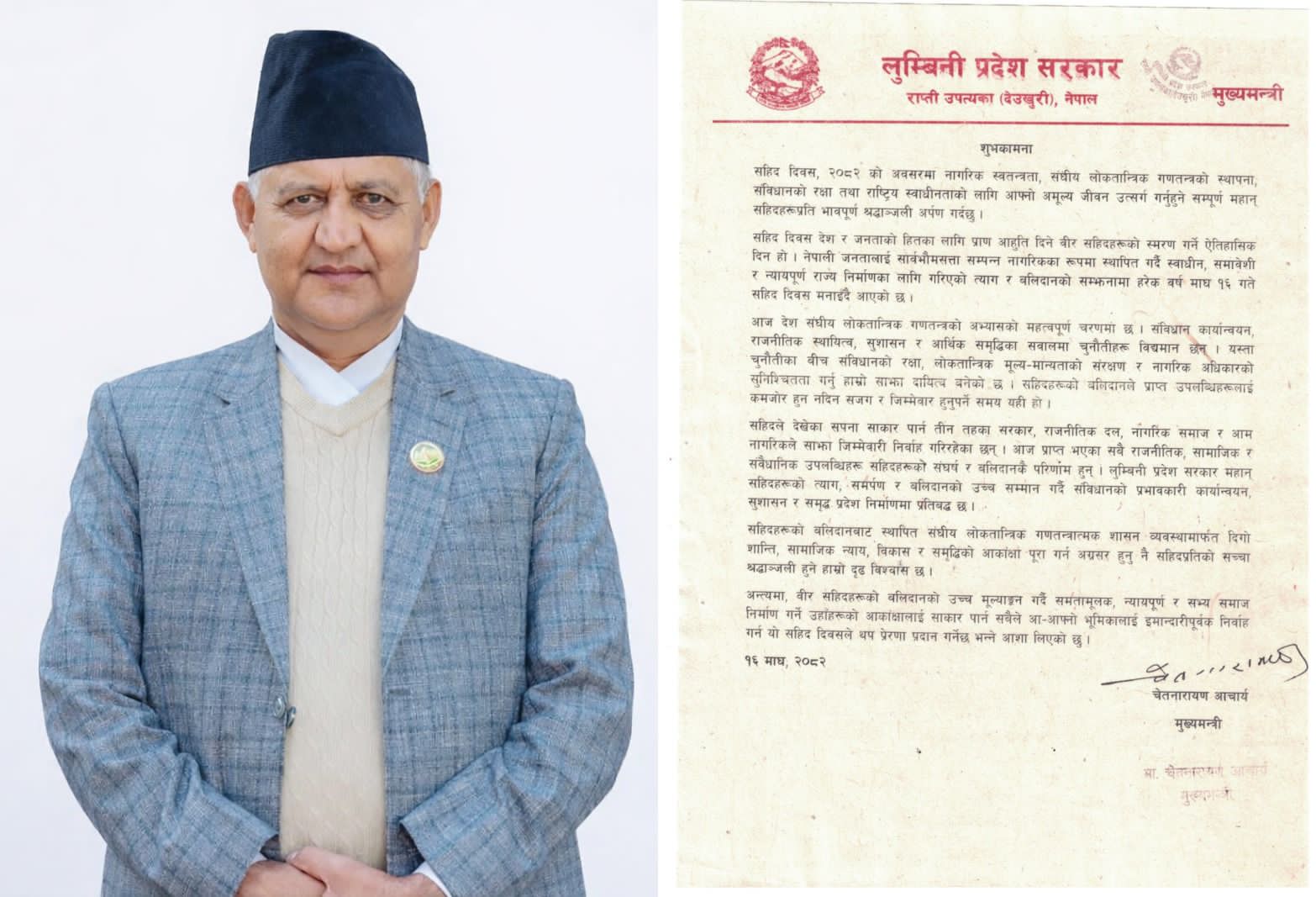 मुख्यमन्त्री आचार्यले लुम्बिनी प्रदेश सरकार महान् सहिदहरूको त्याग, समर्पण र बलिदानको उच्च सम्मान गर्दै संविधानको प्रभावकारी कार्यान्वयन, सुशासन र समृद्ध प्रदेश निर्माणमा दृढतापूर्वक प्रतिबद्ध रहेको स्पष्ट पार्नुभएको छ ।