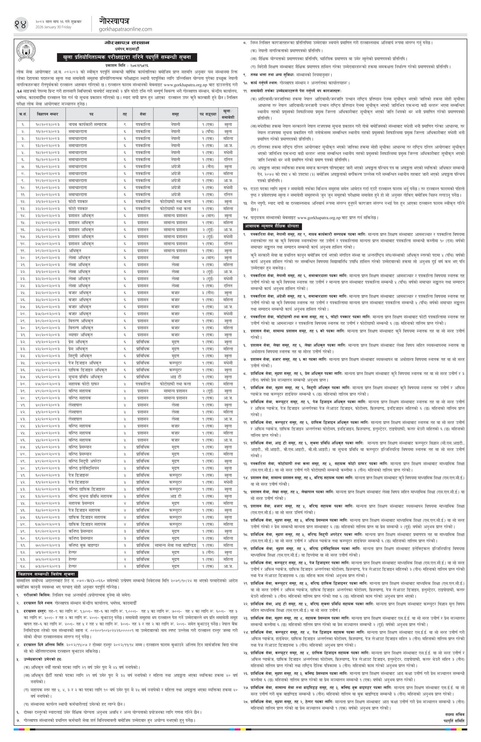 शुक्रबार सूचना जारी गर्दै गोरखापत्र संस्थानले नवौं तहदेखि दोस्रो तहसम्म विभिन्न पदमा कर्मचारी मागेको हो।