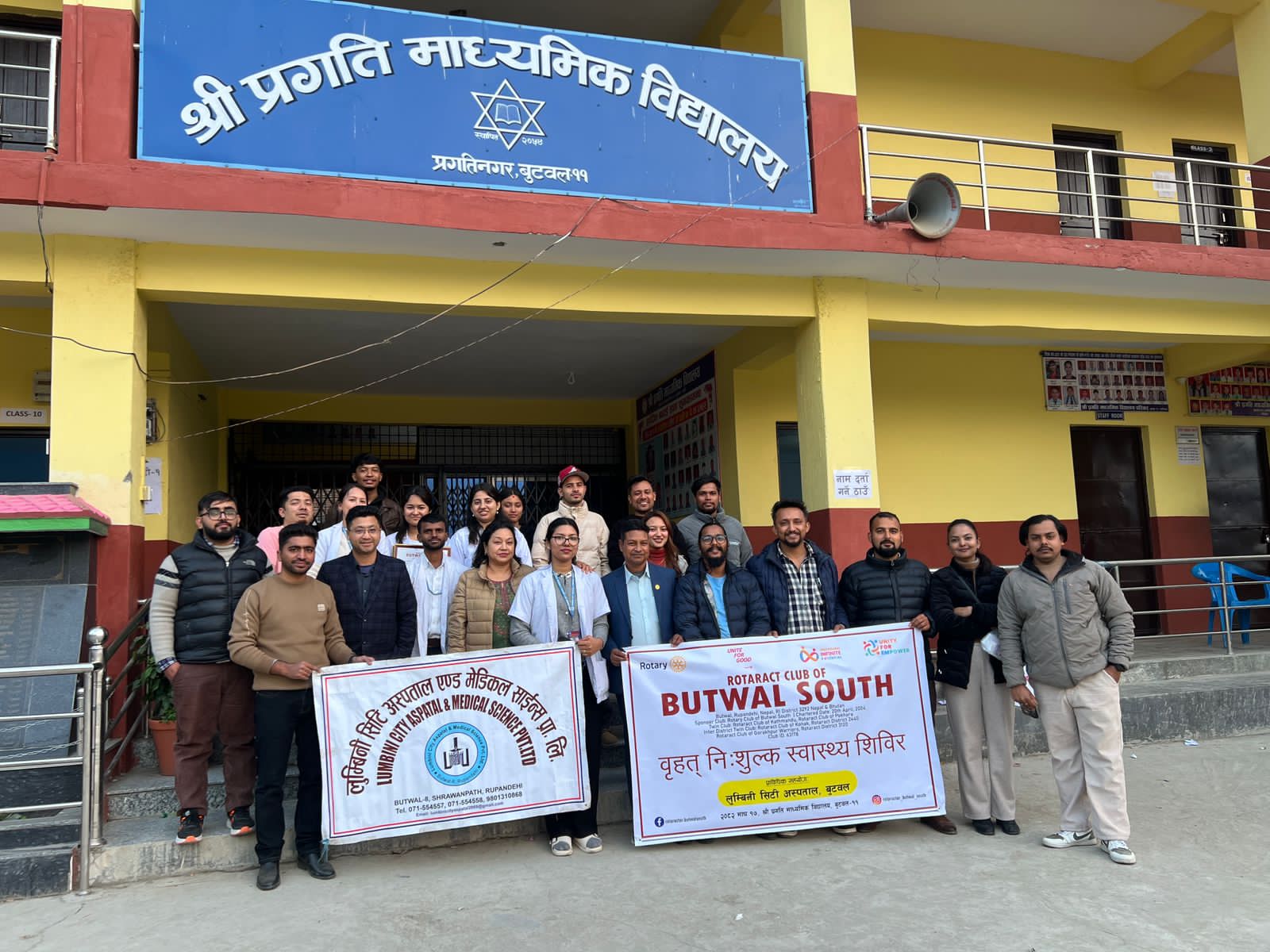 बुटवल ,१७ माघ । रोट्र्याक्ट क्लब अफ बुटवल साउथको आयोजनामा २०८२ माघ १७ गते श्री प्रगति माध्यमिक विद्यालय, बुटवल–११ मा एकदिने निःशुल्क स्वास्थ्य शिविर सफलतापूर्वक सम्पन्न भएको छ। समुदायको स्वास्थ्य सचेतना अभिवृद्धि तथा निःशुल्क स्वास्थ्य सेवा प्रदान गर्ने उद्देश्यले आयोजित उक्त शिविरमा लुम्बिनी सिटी अस्पताल एण्ड मेडिकल साइन्स प्रा. लि. को प्राविधिक तथा चिकित्सकीय सहयोग रहेको थियो।