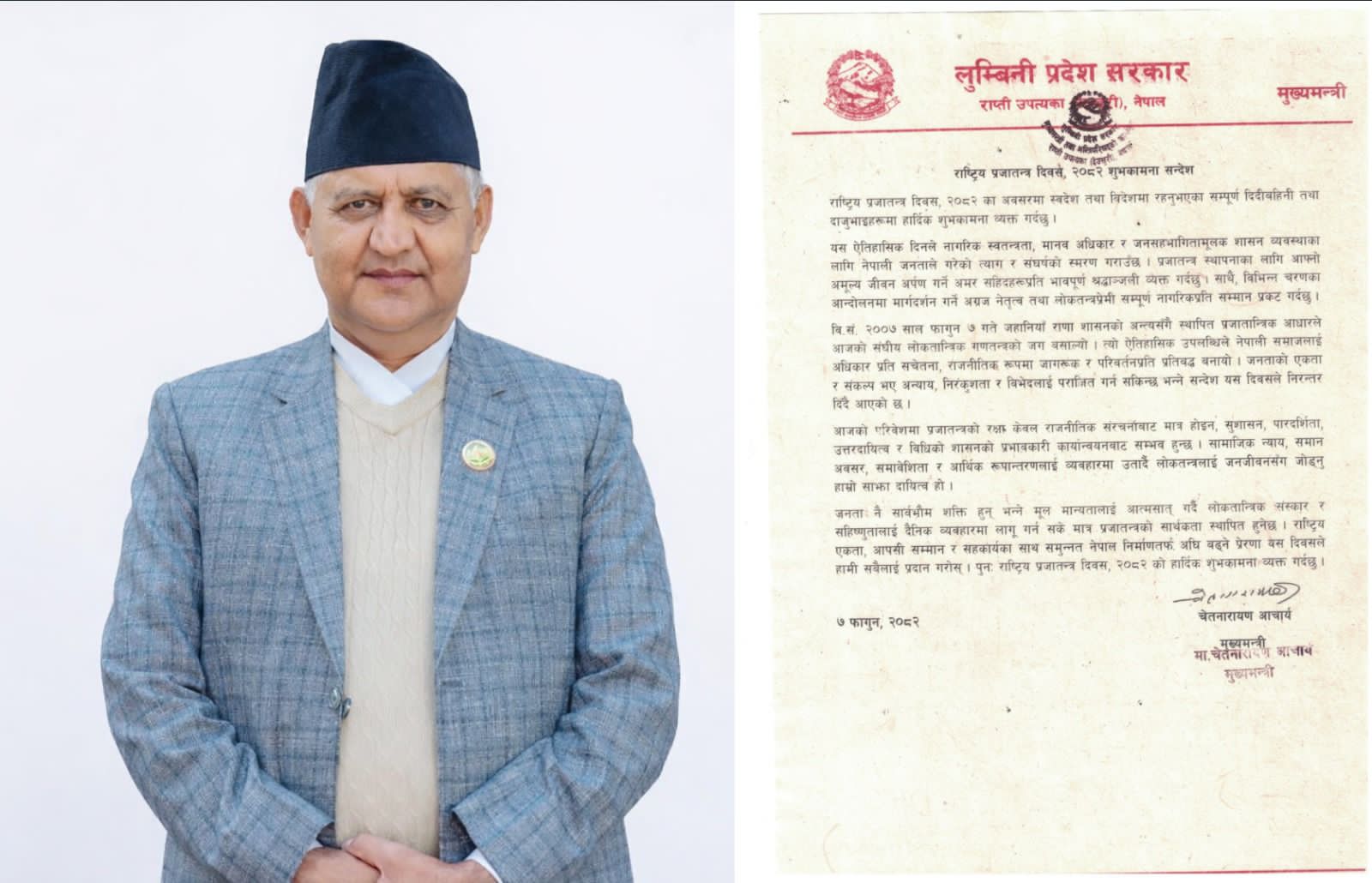 • दाङ,७ फागुन । लुम्बिनी प्रदेशका मुख्यमन्त्री चेतनारायण आचार्यले प्रजातन्त्रको रक्षा राजनीतिक संरचना संगै पारदर्शिता, उत्तरदायित्व र विधिको शासनको प्रभावकारी कार्यान्वयनबाट सम्भव हुने बताउनुभएको छ । राष्ट्रिय प्रजातन्त्र दिवस, २०८२ का अवसरमा शुभकामना सन्देश जारी गर्दै उहाँले लोकतन्त्रलाई जनजीवनसँग जोड्दै सामाजिक न्याय, समान अवसर र आर्थिक रूपान्तरण सुनिश्चित गर्नुपर्नेमा जोड दिनुभएको हो ।