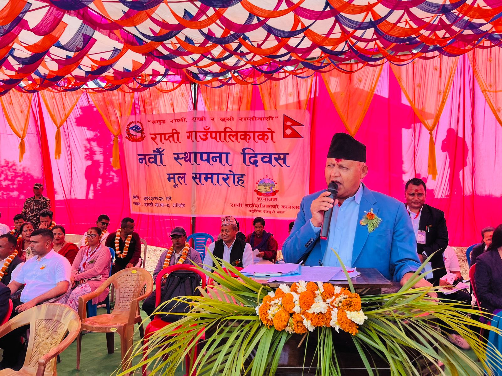 राप्ती गाउँपालिकाको नवौँ स्थापना दिवसका अवसरमा शुक्रबार देविकोटमा आयोजित कार्यक्रमको उद्घाटन गर्दै मुख्यमन्त्री आचार्यले धार्मिक, सांस्कृतिक तथा खेल पर्यटन प्रवद्र्धनका लागि पूर्वाधार विकाससँगै सामाजिक विकासलाई पनि प्राथमिकतामा राखिएको स्पष्ट पार्नुभयो ।