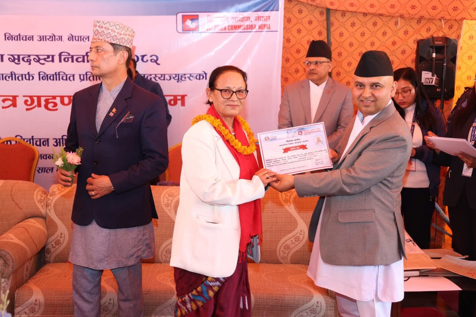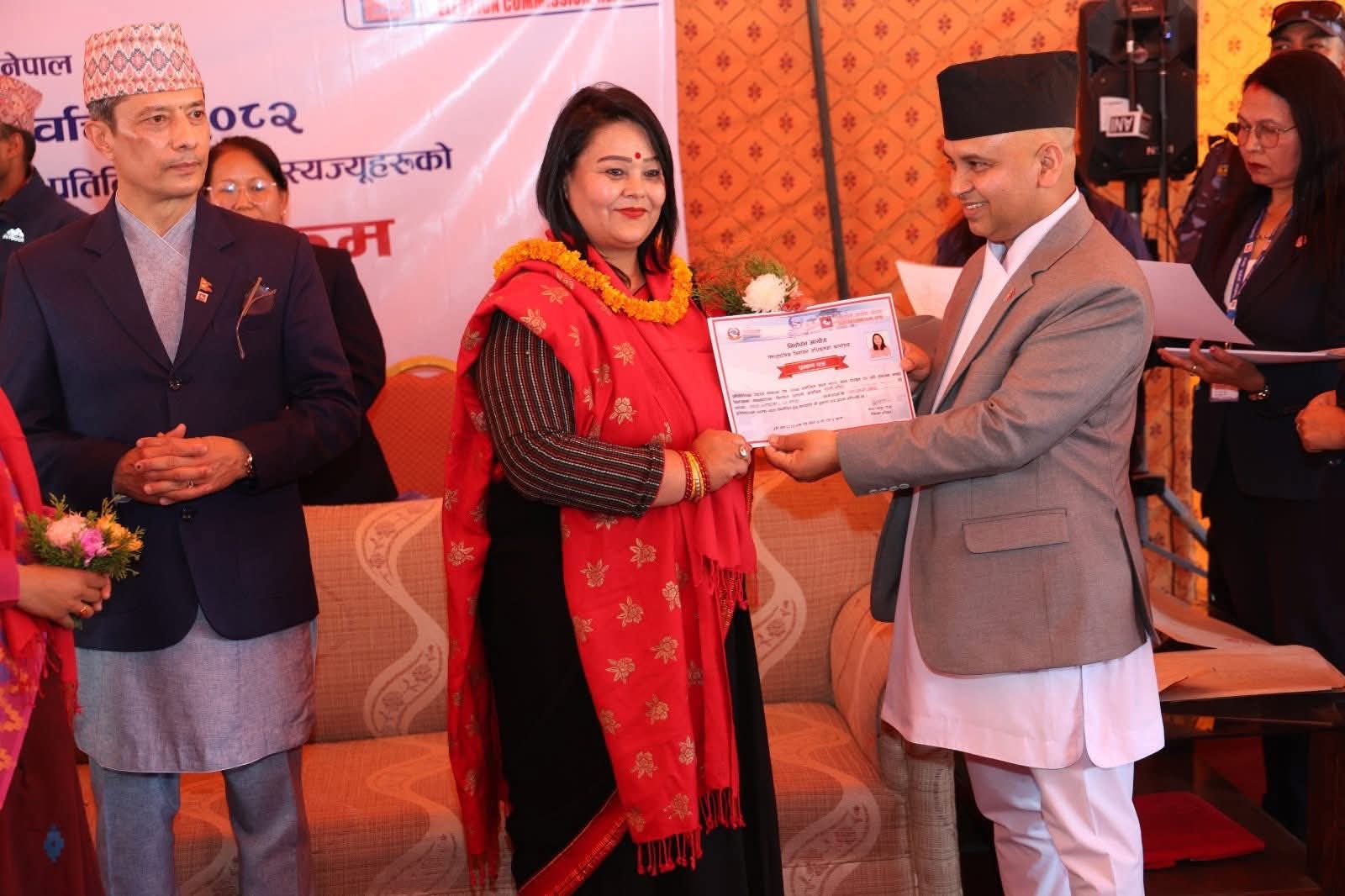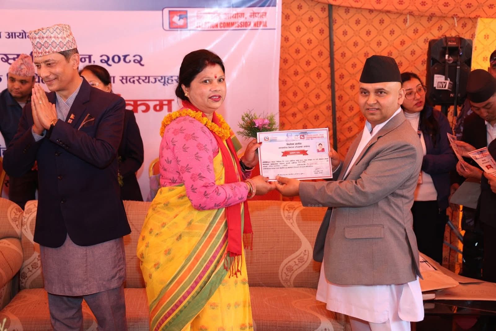 प्रतिनिधिसभा सदस्य निर्वाचन, २०८२ अन्तर्गत समानुपातिक निर्वाचन प्रणालीबाट निर्वाचित सदस्यहरुलाई निर्वाचितको प्रमाणपत्र हस्तान्तरण गर्नुहुँदै आयोगका सचिव एवम् समानुपातिक निर्वाचन प्रणालीतर्फका निर्वाचन अधिकृत कृष्णबहादुर राउत। कार्यक्रममा निर्वाचन आयोगका कार्यवाहक प्रमुख निर्वाचन आयुक्त रामप्रसाद भण्डारी, आयुक्तद्वय डा. जानकी कुमारी तुलाधर र सगुन शम्शेर जबरा लगायत आयोगका कर्मचारीहरुको उपस्थिति रहेको थियो। तस्बिर: प्रदीपराज वन्त/ निर्वाचन आयोग