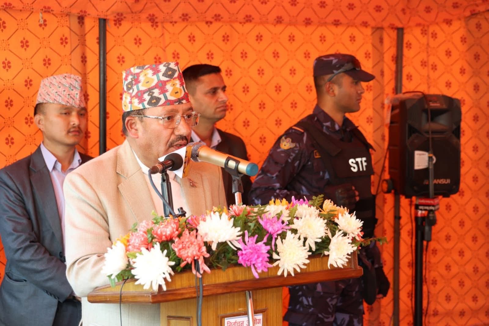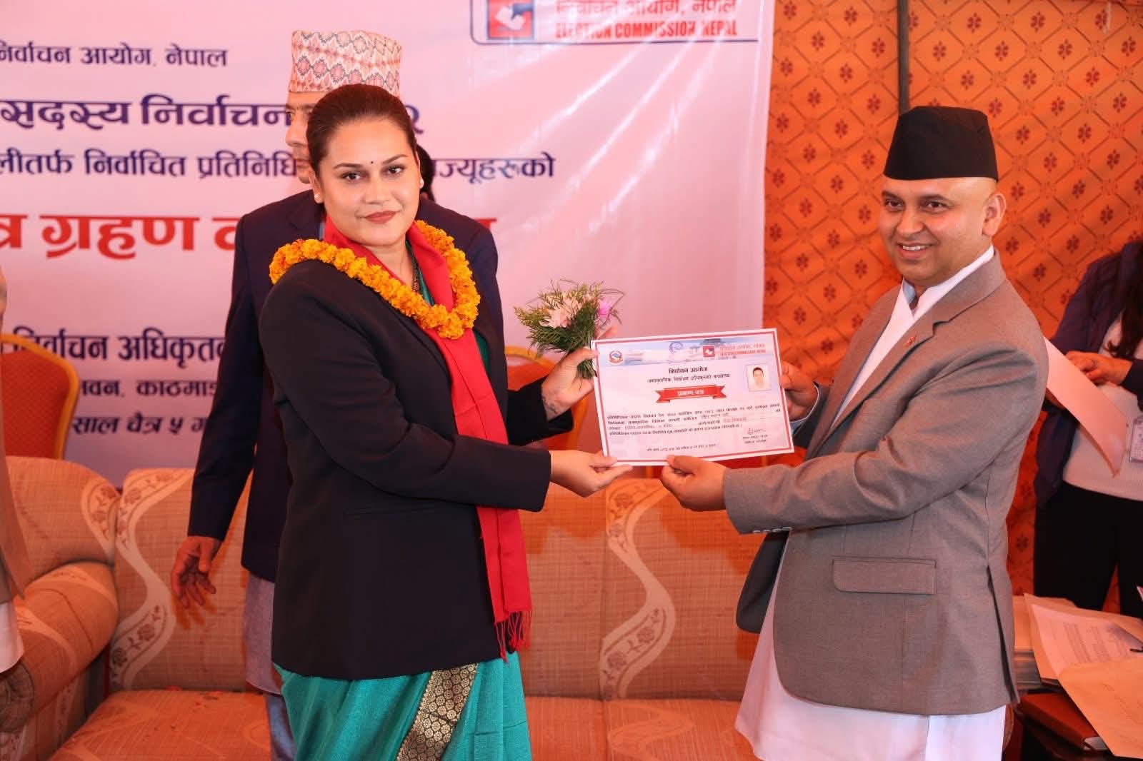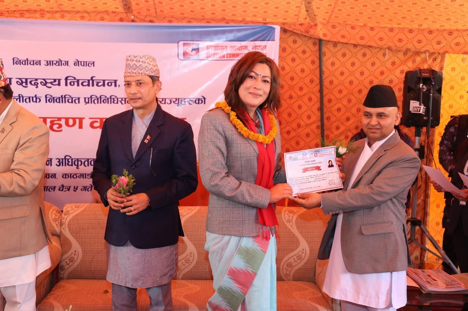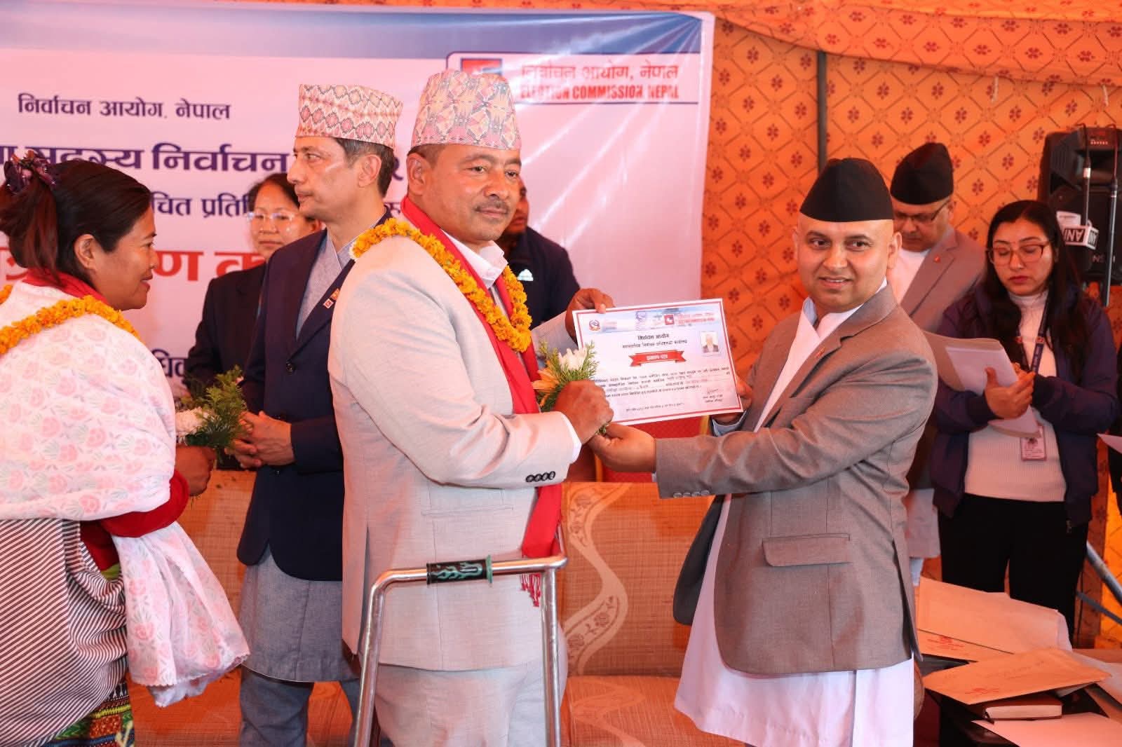 प्रतिनिधिसभा सदस्य निर्वाचन, २०८२ अन्तर्गत समानुपातिक निर्वाचन प्रणालीबाट निर्वाचित सदस्यहरुलाई निर्वाचितको प्रमाणपत्र हस्तान्तरण गर्नुहुँदै आयोगका सचिव एवम् समानुपातिक निर्वाचन प्रणालीतर्फका निर्वाचन अधिकृत कृष्णबहादुर राउत। कार्यक्रममा निर्वाचन आयोगका कार्यवाहक प्रमुख निर्वाचन आयुक्त रामप्रसाद भण्डारी, आयुक्तद्वय डा. जानकी कुमारी तुलाधर र सगुन शम्शेर जबरा लगायत आयोगका कर्मचारीहरुको उपस्थिति रहेको थियो। तस्बिर: प्रदीपराज वन्त/ निर्वाचन आयोग