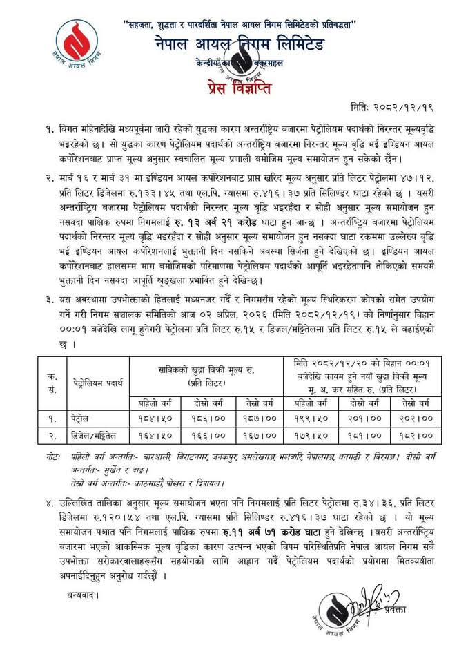 चैत २० गते (अहिले मध्यरात) बिहानैदेखि लागु हुनेगरी आयल निगमले मूल्यवृद्धि गरेको जनाएको छ ।
