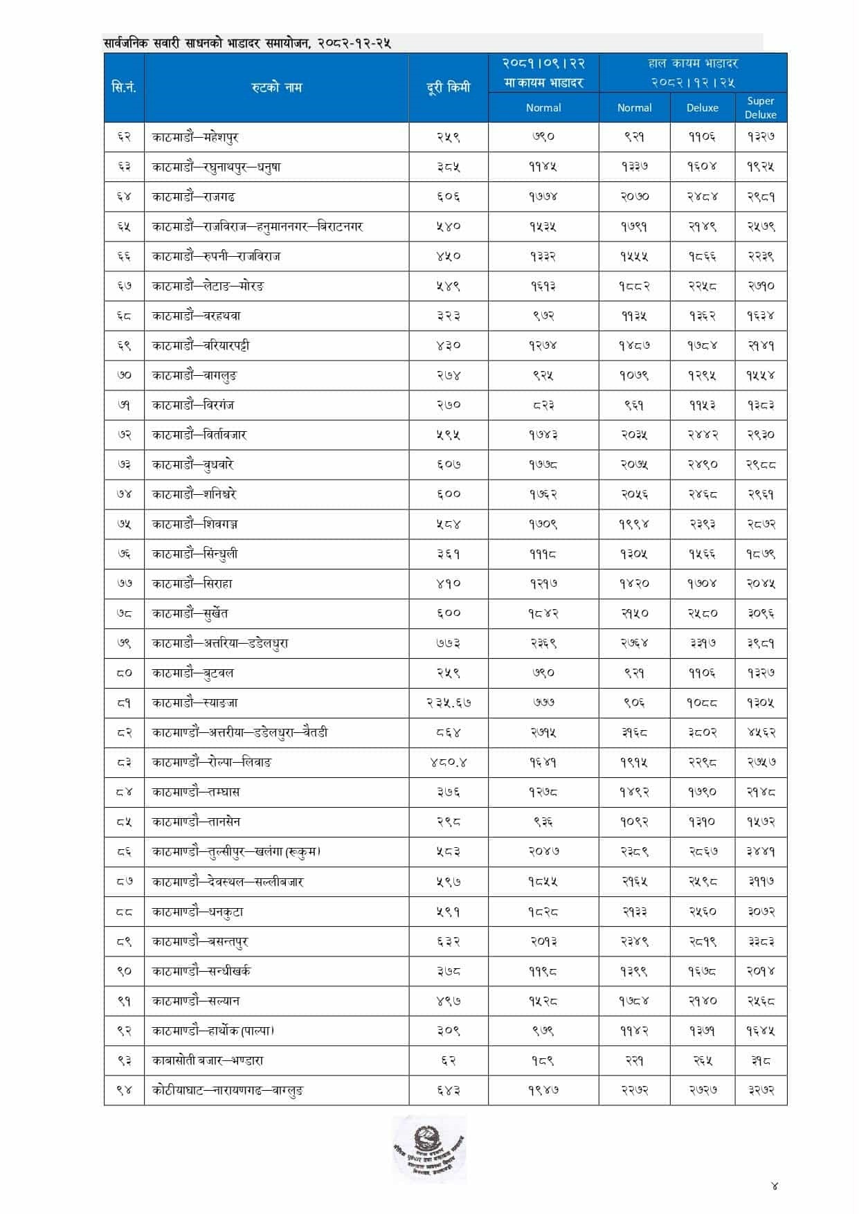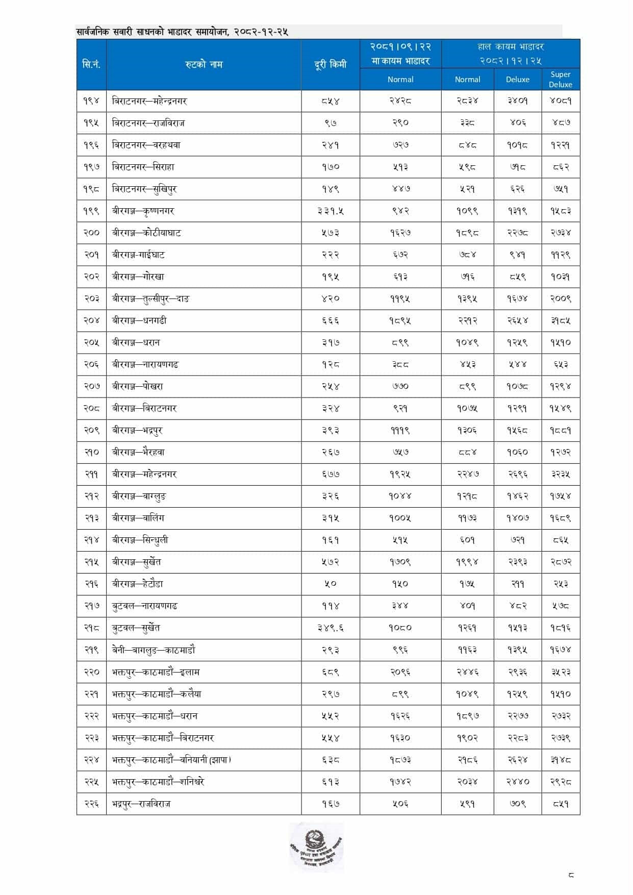 यात्रीवाहक सवारीमा करिब १६.७१ प्रतिशतले भाडा वृद्धि गरिएको छ। मालवाहक सवारीतर्फ पहाडी मार्गमा सञ्चालन हुने गाडीको भाडा करिब २१.६८ प्रतिशतले बढाइएको छ भने तराई मार्गमा सञ्चालन हुने गाडीको भाडा करिब १५.७५ प्रतिशतले समायोजन गरिएको छ।
