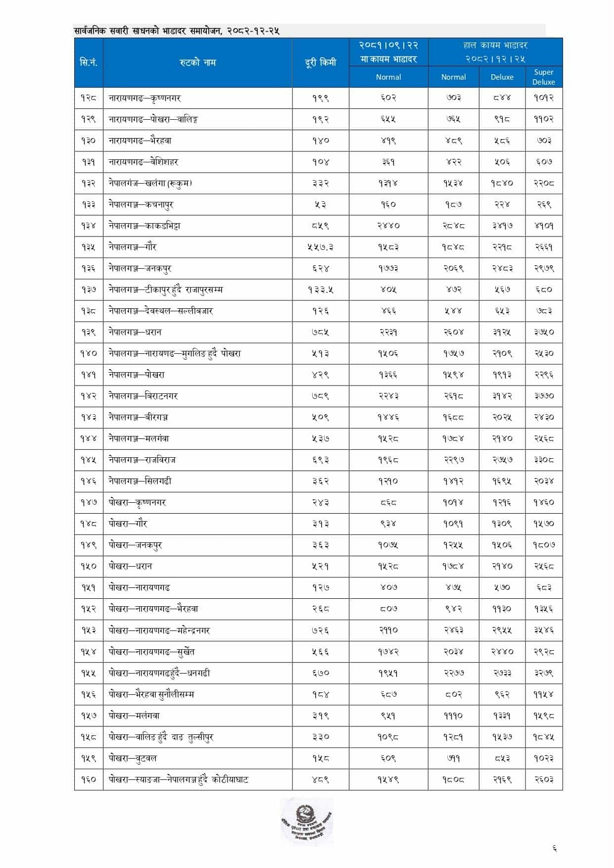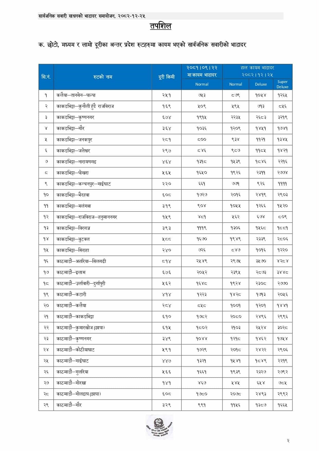 यात्रीवाहक सवारीमा करिब १६.७१ प्रतिशतले भाडा वृद्धि गरिएको छ। मालवाहक सवारीतर्फ पहाडी मार्गमा सञ्चालन हुने गाडीको भाडा करिब २१.६८ प्रतिशतले बढाइएको छ भने तराई मार्गमा सञ्चालन हुने गाडीको भाडा करिब १५.७५ प्रतिशतले समायोजन गरिएको छ।